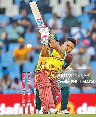 King reigns over opening exchanges South Africa had things under control in the first four overs as West Indies reached 29 for 1. At that stage, King was on three off of five, but immediately punched Anrich Nortje over the gap between cover and mid-off to start the fifth over with a four. King hit the next ball straight down the ground for four more and then outrageously backed away from his stumps as the ball landed outside off and still managed to flay it over for six. Nortje got a dot ball in before King moved again and edged for four before he smashed the final-ball full toss over cover and ended the over on 27 off 11. Nortje’s opening over cost 24 runs, and he was taken out of the attack, but not for long.