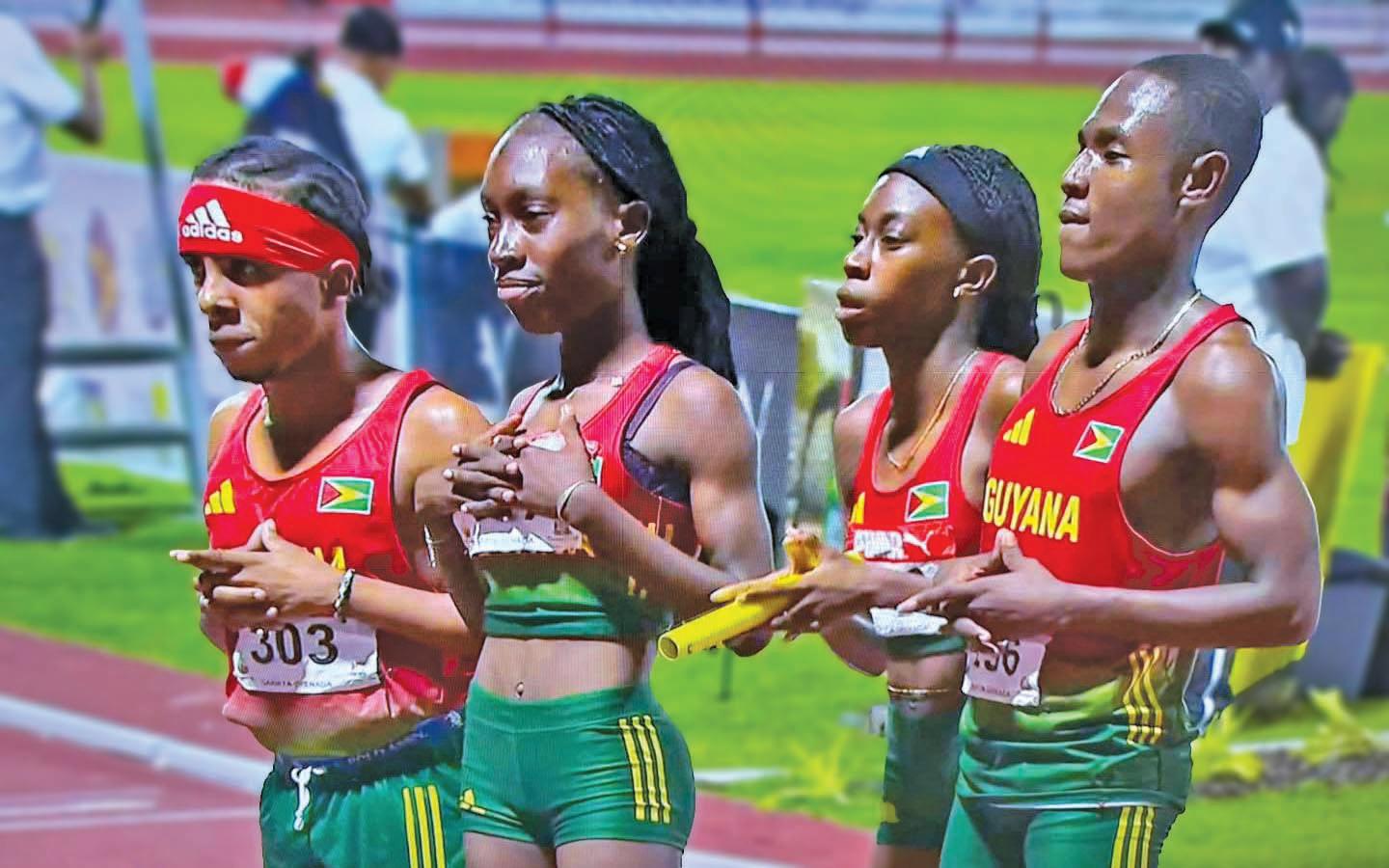 The Kirani James Athletics Stadium in Grenada was set alight by Guyana’s team of Tianna Springer, Malachi Austin, Narissa McPherson, and Dh Neilson Gill, who stopped the clock at 3:23.51 for first place.