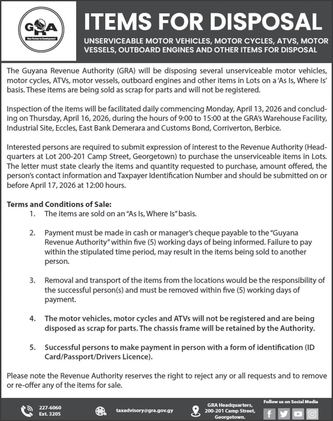 Malgre Tout, West Bank Demerara, (South of Masjid) – Lot “C” (1.347 acres) 58,675 sq ft. Available Long Term 20-25 years. Sign on property. Phone/WhatsApp: 592 615 2270/592 628 8619.