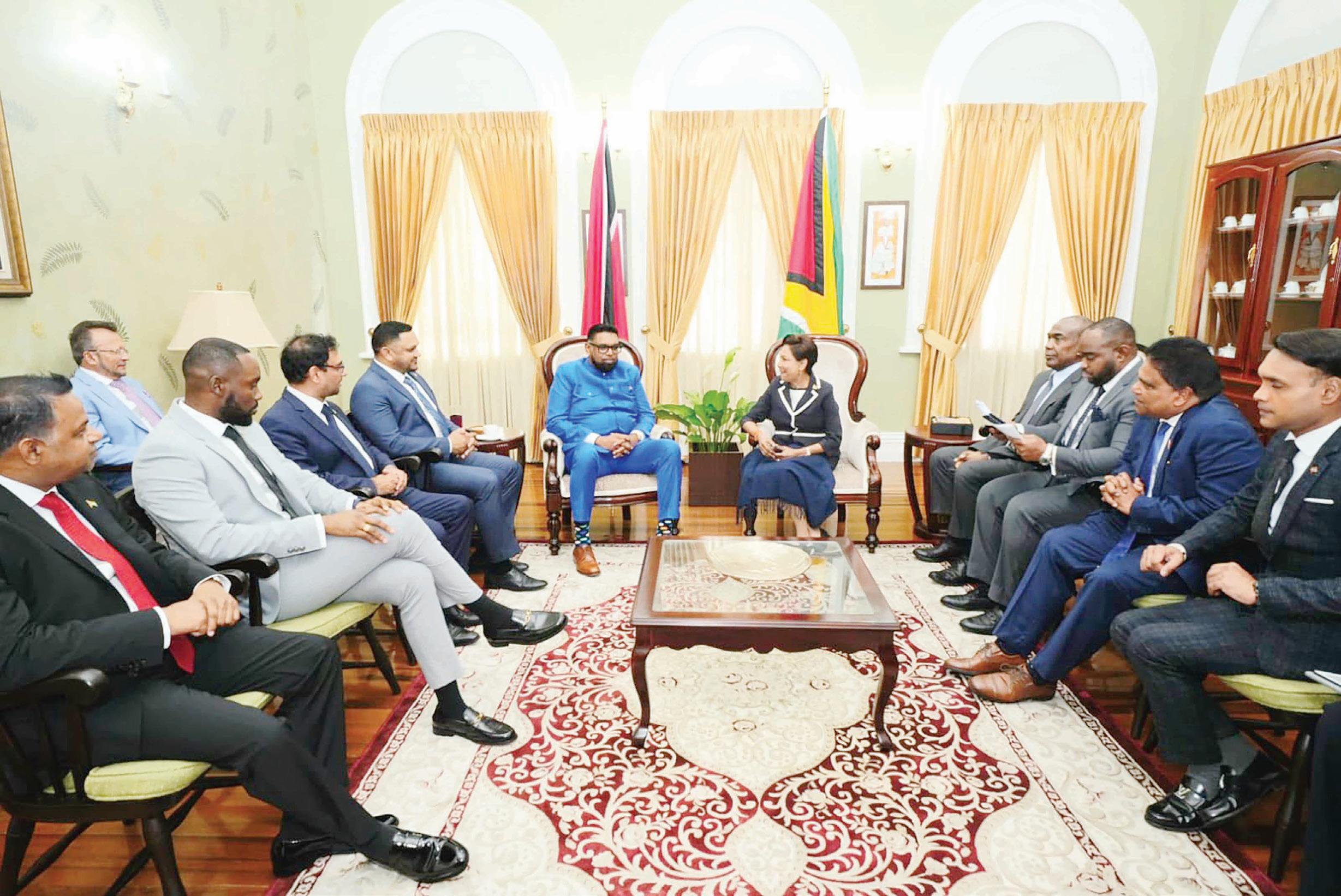 President Ali travelled to the Twin-Island Republic on Friday to deliver the feature address at the T&T Chamber of Industry and Commerce Annual Meeting. While there, President Ali and his delegation, comprising several cabinet Ministers, met with the Trinidadian PM and her team.