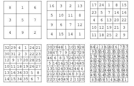 The unique normal square of order three was known to the ancient Chinese, who called it the Lo Shu. A version of the order-4 magic square with the numbers 15 and 14 in adjacent middle columns in the bottom row is called Dürer's magic square. Magic squares of order 3 through 8 are shown above.