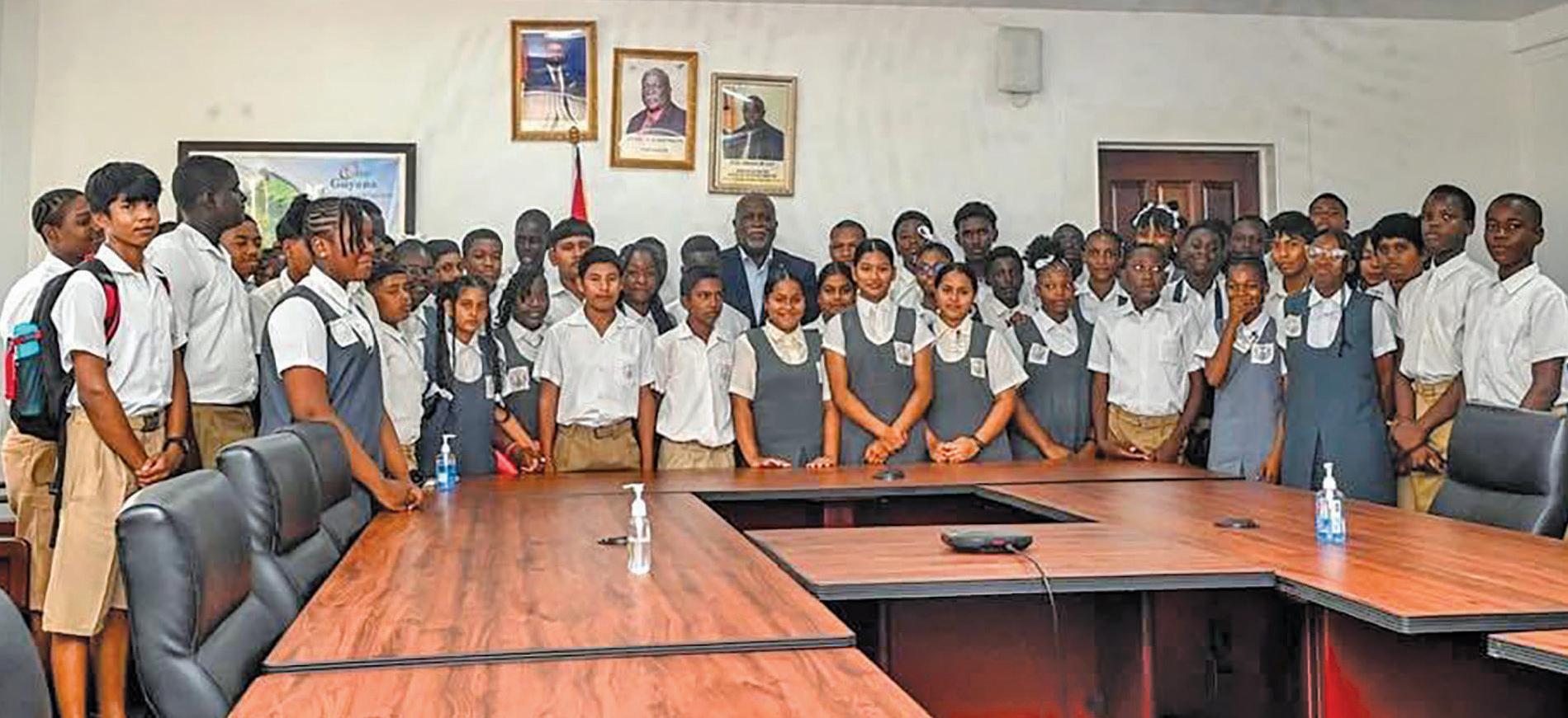 Prime Minister Brigadier (Ret’d) Mark Phillips on Friday engaged in discussion with students of the Mahaicony Secondary School during their visit to the Office of the Prime Minister