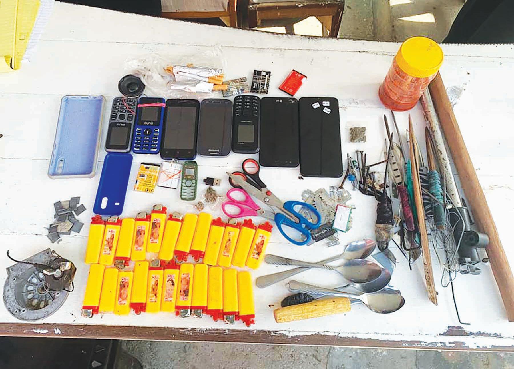 Only a few weeks ago a joint search exercise conduct ed at the New Amsterdam Prison unearthed a num ber of illegal items including two Samsung and one ZTE cellular phones; four phone batteries; 60 zip lock bags with a quantity of leaves, seeds, and stems suspected to be cannabis amounting to 37.9 grams; one Digicel SIM card; 37 lighters; four phone chargers; 18 razor blades; 10 improvised weapons, and two pairs of scissors.