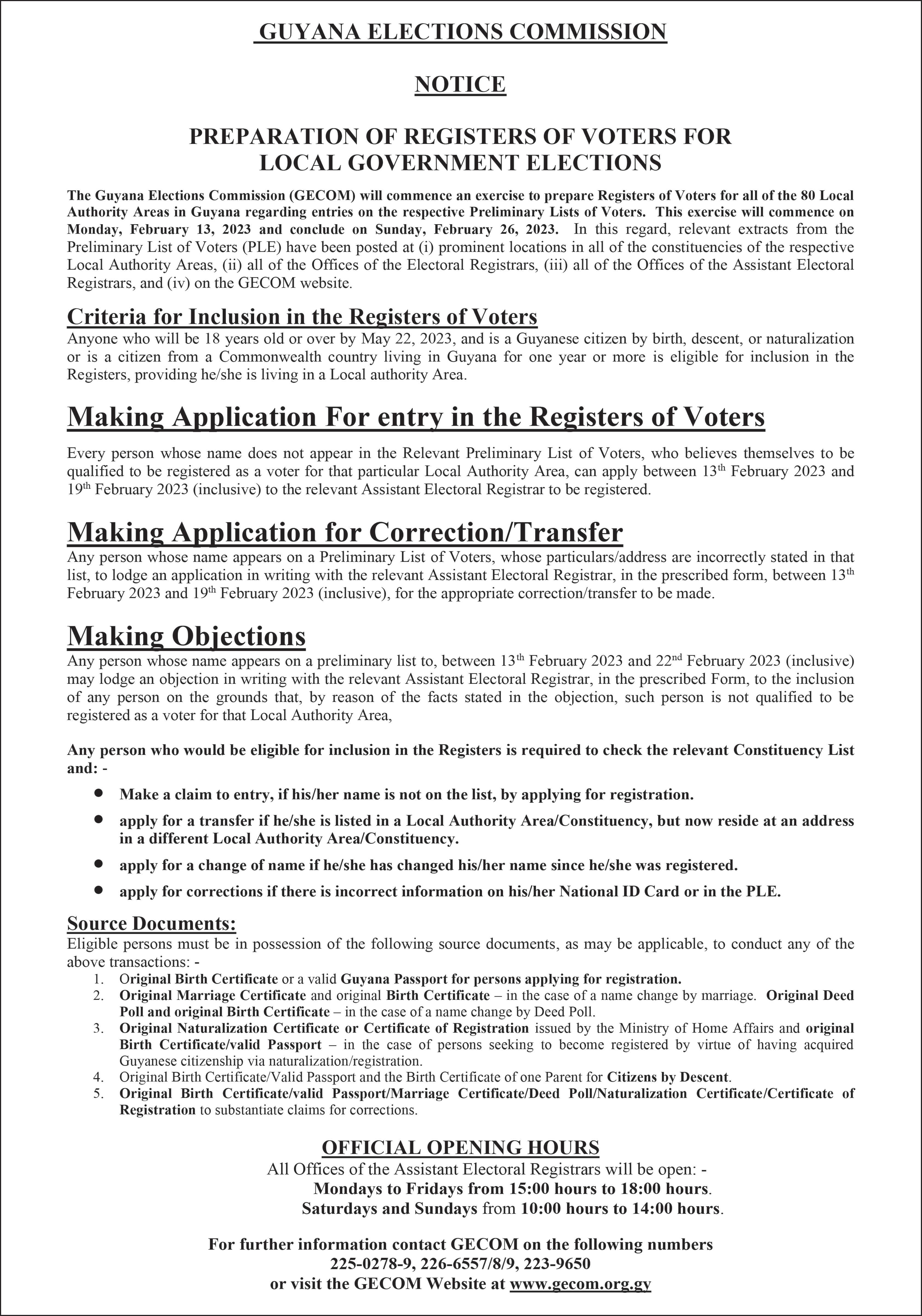 Hence, anyone who would be eighteen years or over by May 22, 2023, and is a Guyanese citizen by birth, descent, or naturalization, or is a citizen from a Commonwealth country living in Guyana for one year or more, is eligible for inclusion in the Registers, providing he/she is living in a Local Authority Area.