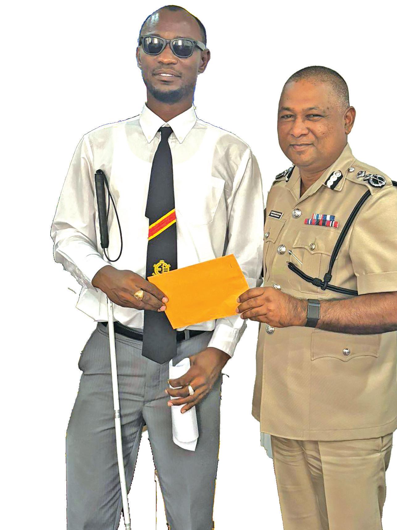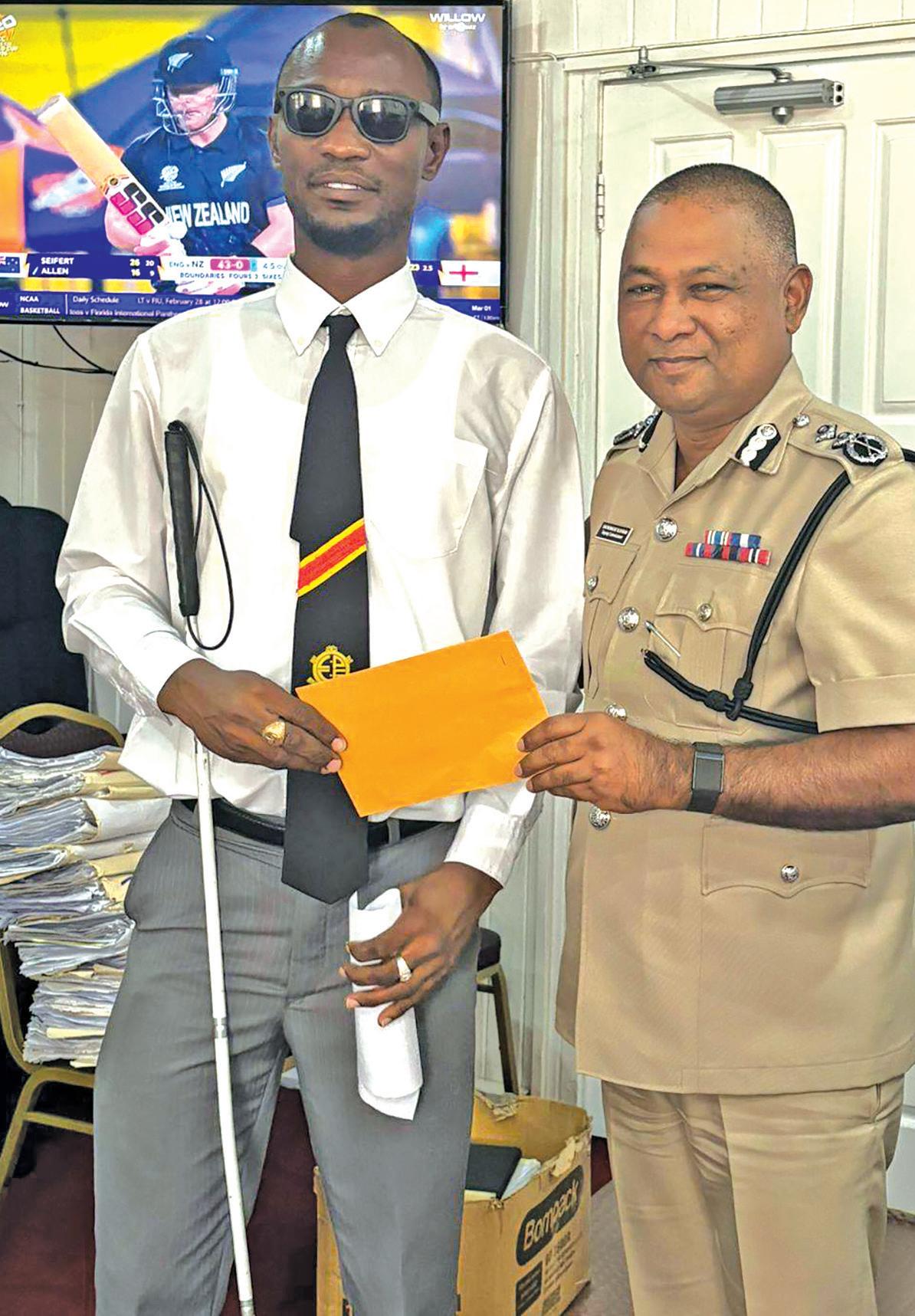 Deputy Commissioner Ravindradat Budhram hands over the donation to the captain of the Blind Cricket Team, Leroy Phillips