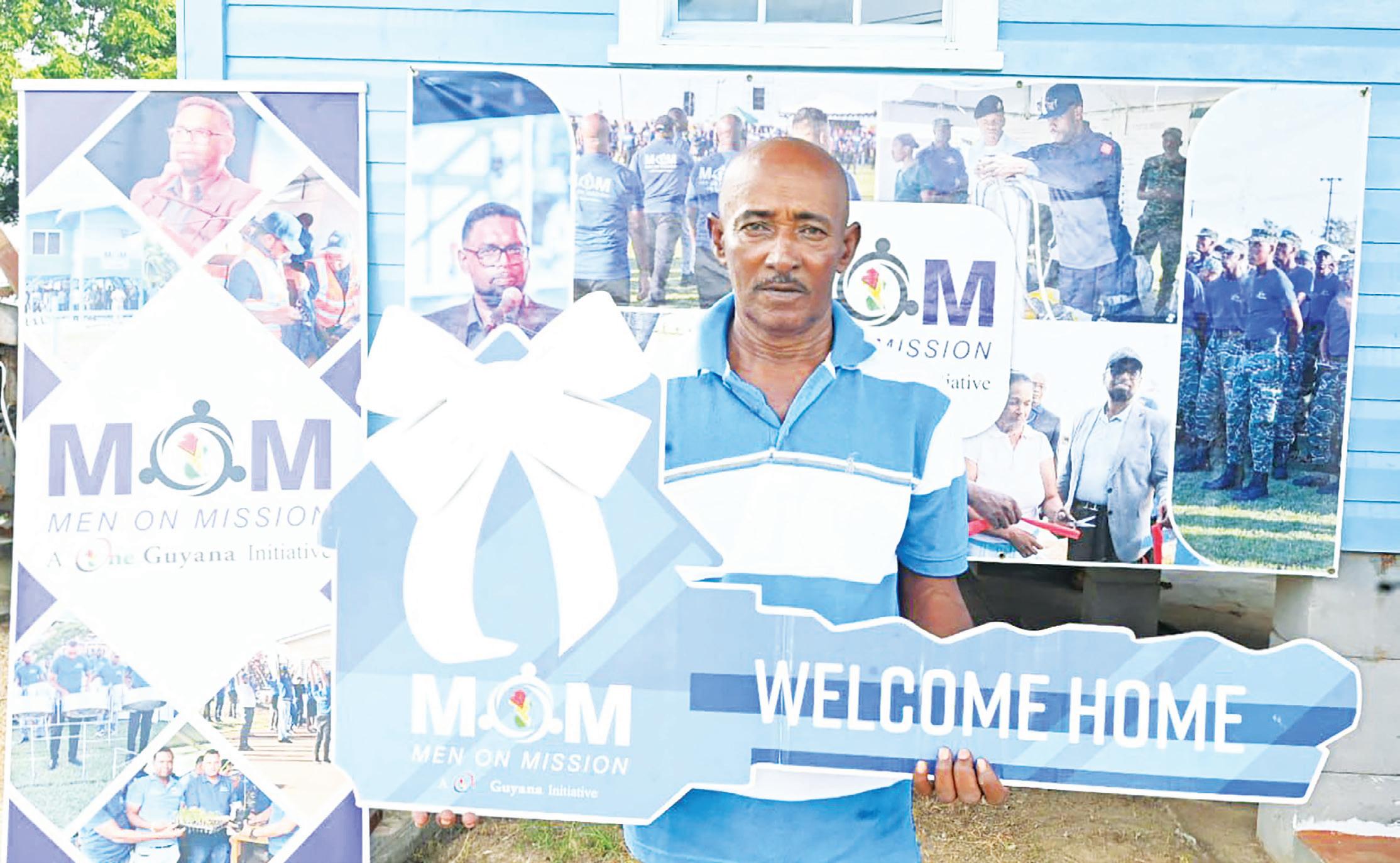 Isaac Thompson, a 63-year-old resident of Greenwich Park, East Bank Essequibo, is now the proud owner of a two-bedroom home, courtesy of the Men on Mission (MOM) initiative. He received the key to his new home from Minister Deodat Indar and members of MOM