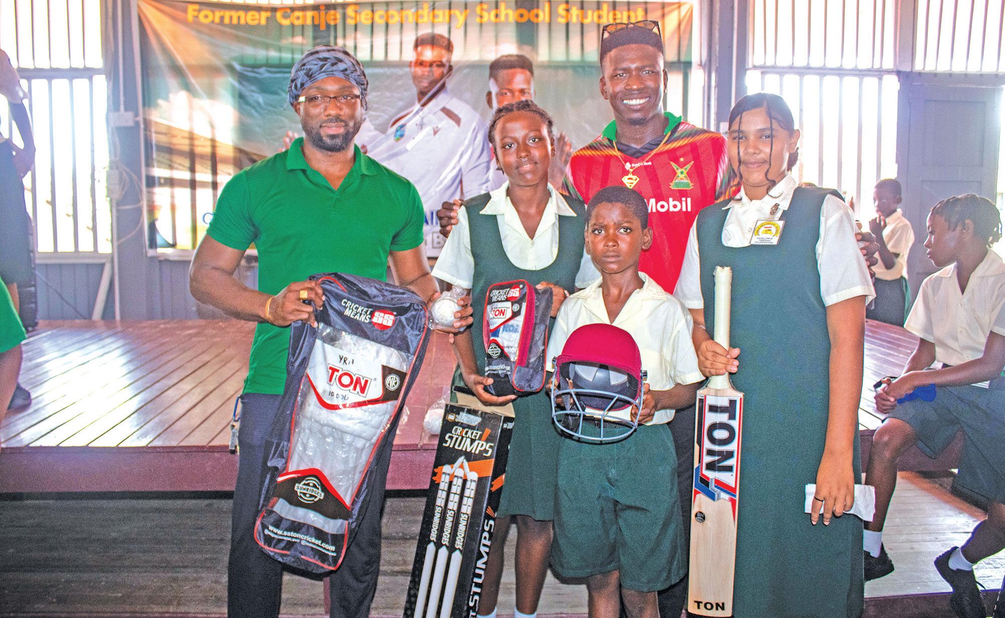 It was a trip back in time on Friday for Guyana, West Indies and Amazon Warriors’ all-rounder Kevin Sinclair and Guyana Harpy Eagles pacer Nial Smith, who took some time out of their busy schedules to ‘pay it forward’ to their alma mater, Canje Secondary, at Cumberland, East Canje Berbice.