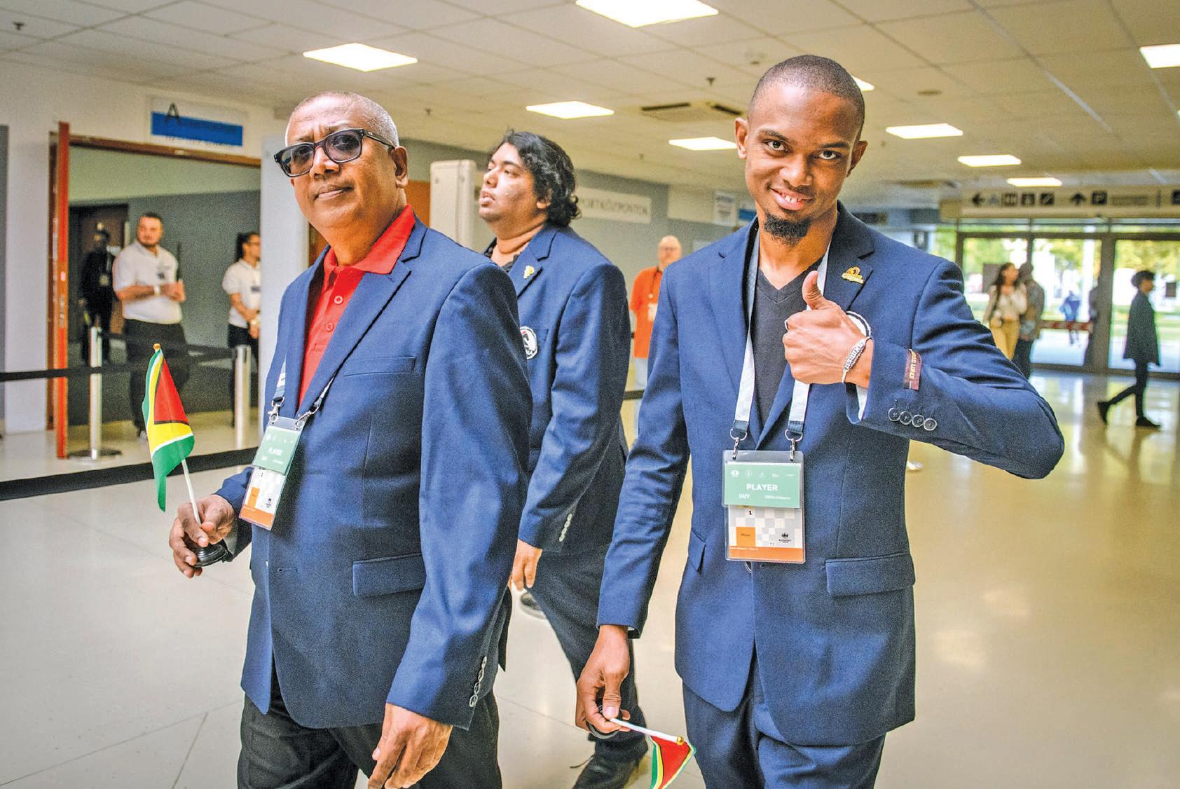 A smiling Anthony Drayton (L) shares a thumbs up alongside Guyanese teammates Loris Nathoo and Taffin Khan (back) at the 45th Chess Olympiad (FIDE photo)