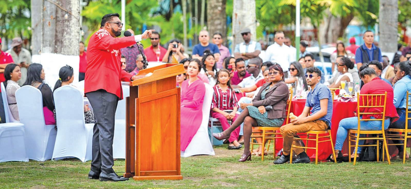 President Dr Irfaan Ali addressing the gathering at his Labour Day Brunch at State House on Wednesday