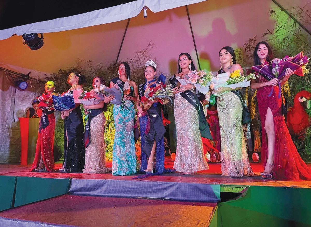 Miss Bartica Regatta 2026 Novita Pawelae, along with first runner-up Benyerlin Hernandez and second runner-up Trinesia Roberts and other contestants of the pageant, on Sunday night (Miss Bartica Regatta Pageant/Facebook)