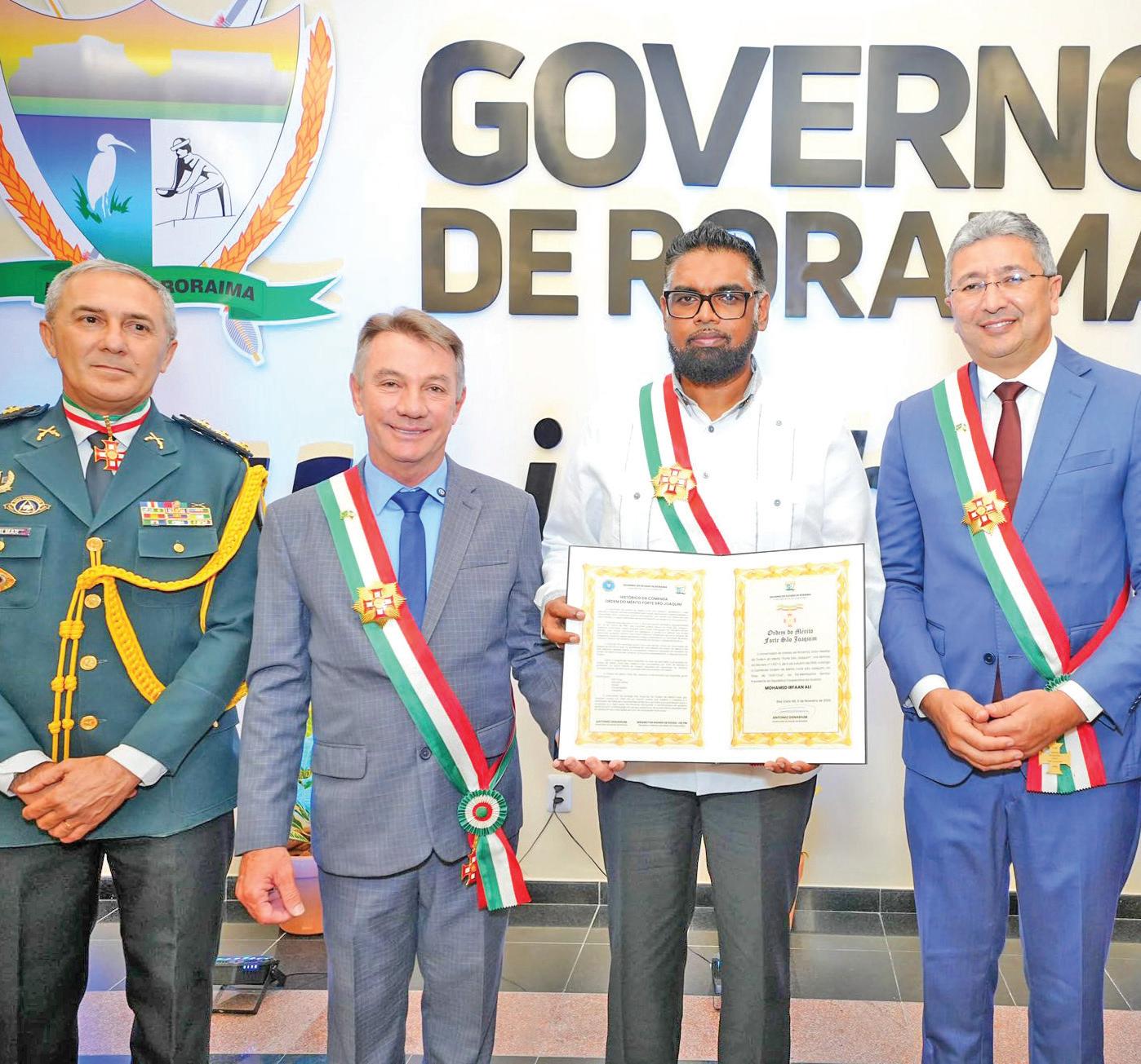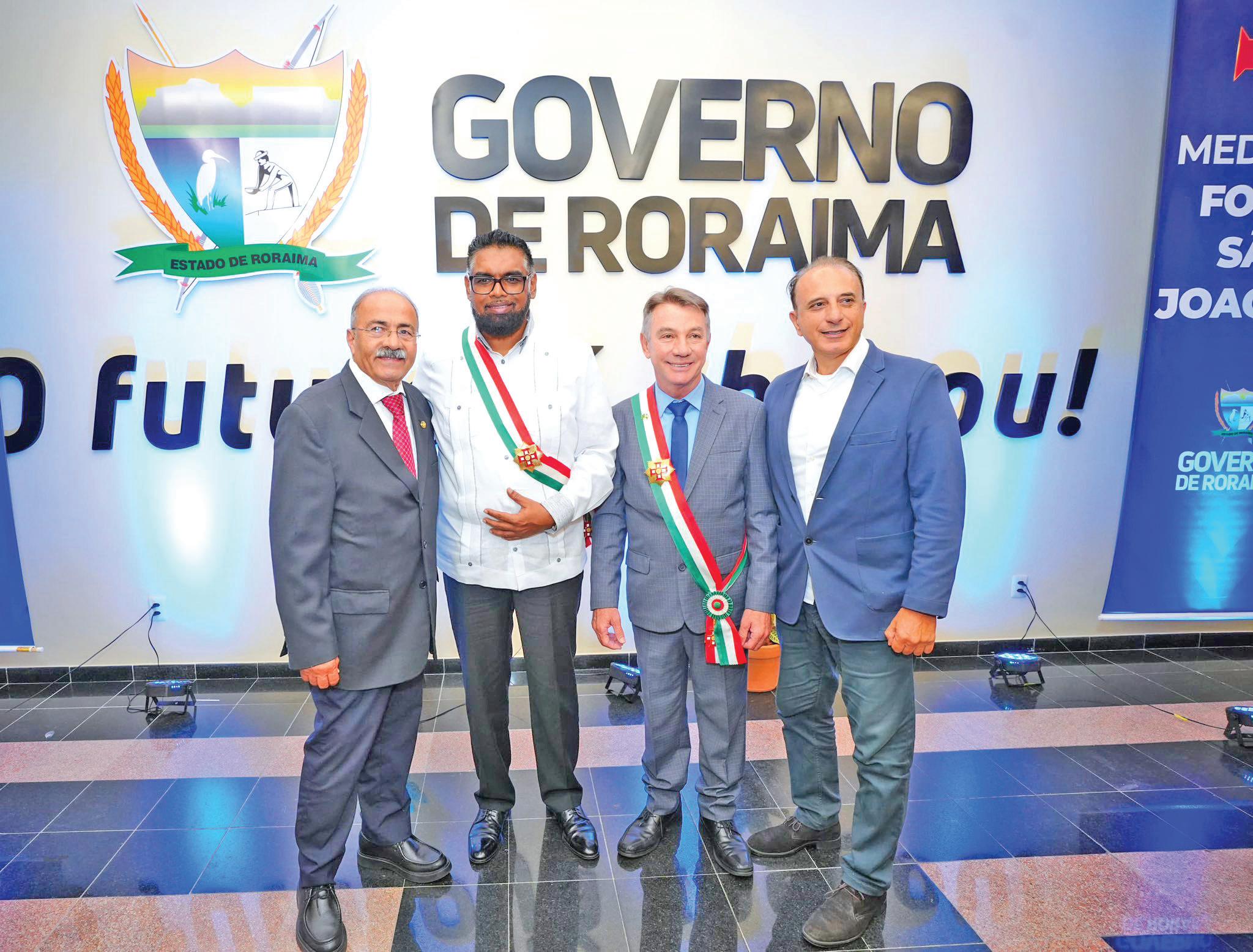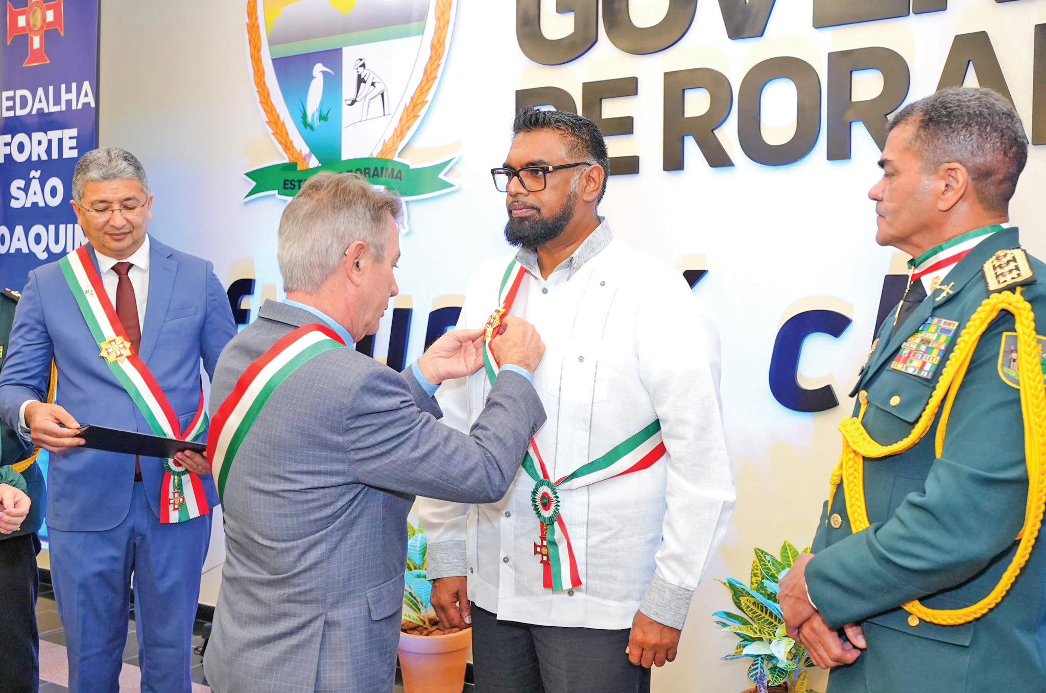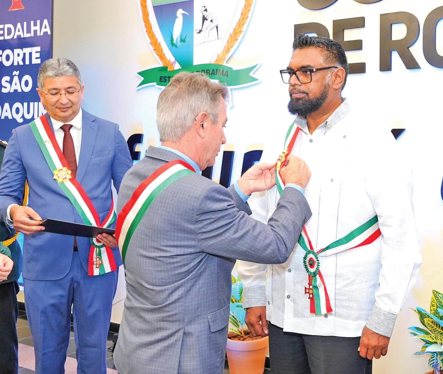President Dr Irfaan Ali was on Monday conferred with the State of Roraima’s highest award, the Order of Merit Forte São Joaquim (Medalha Forte São Joaquim) in Boa Vista, Brazil. The conferment, at the highest degree of the Grand Cross, took place at the Augusto Cardoso Noble Hall at the Senator Hélio Campos Palace. The Order was presented to the Head of State by Governor Antonio Denarium in recognition of the strengthening economic ties between the two countries. In his acceptance speech, the President