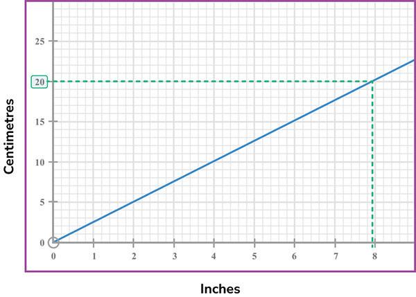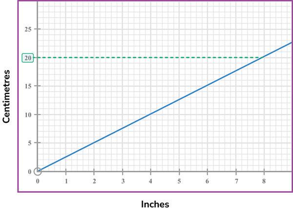 Draw a horizontal line from 20 centimetres to the conversion line.