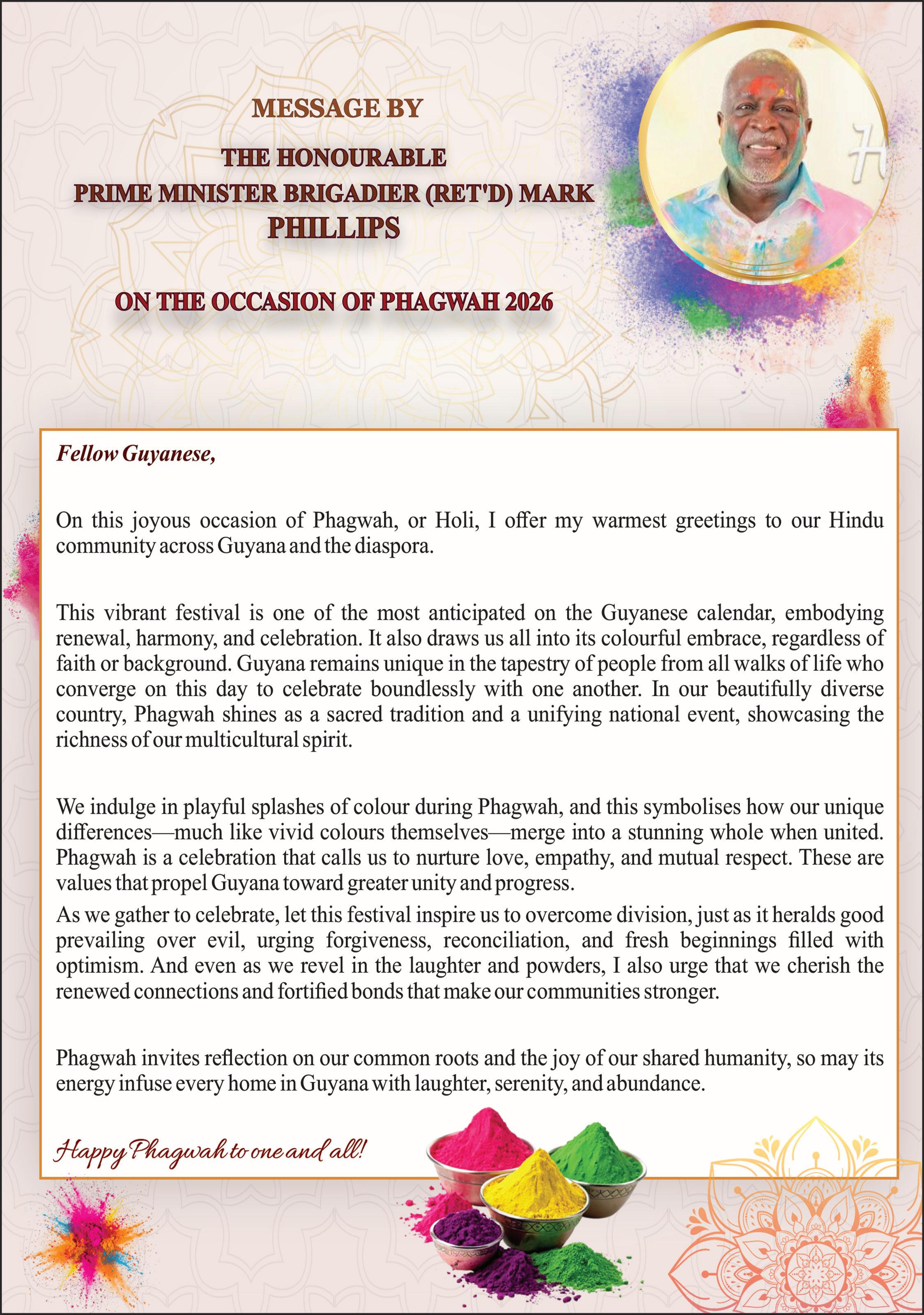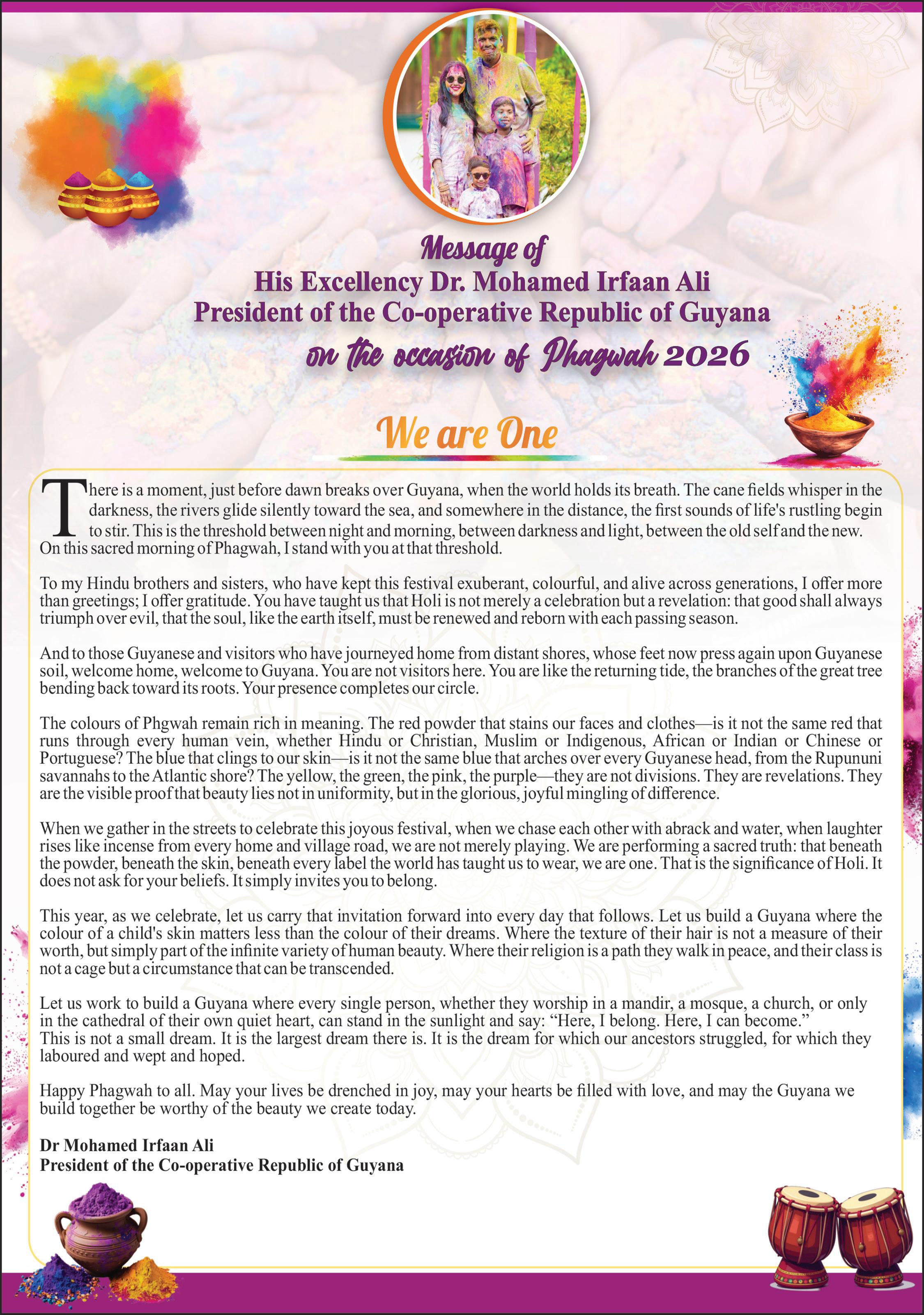 “Happy Phagwah to all. May your lives be drenched in joy, may your hearts be filled with love, and may the Guyana we build together be worthy of the beauty we create today.”