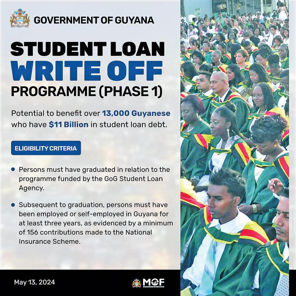 On Monday in a live broadcast, Dr Singh said that the parameters of phase one Student Loan Write Off Programme include the writing off all loans owed by Guyanese who are able to demonstrate that they completed their course of study and graduated. This also includes, he said, that subsequent to graduation, the persons were employed or self-employed in Guyana for a minimum of three years, as evidenced by a minimum of 156 contributions made to the National Insurance Scheme.