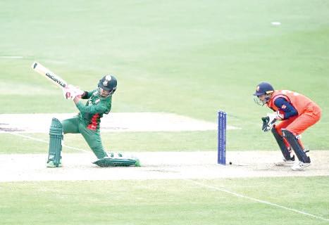 Bangladesh's deep bat ting line-up helped them here, because after Afif and Nurul were dismissed by de Leede in the 18th over, Number 8 Mosaddek Hossain breezed to an un beaten 20 off 12 balls. He crashed de Leede through the off side before hammer ing a six over the covers in the final over, bowled by de Leede.