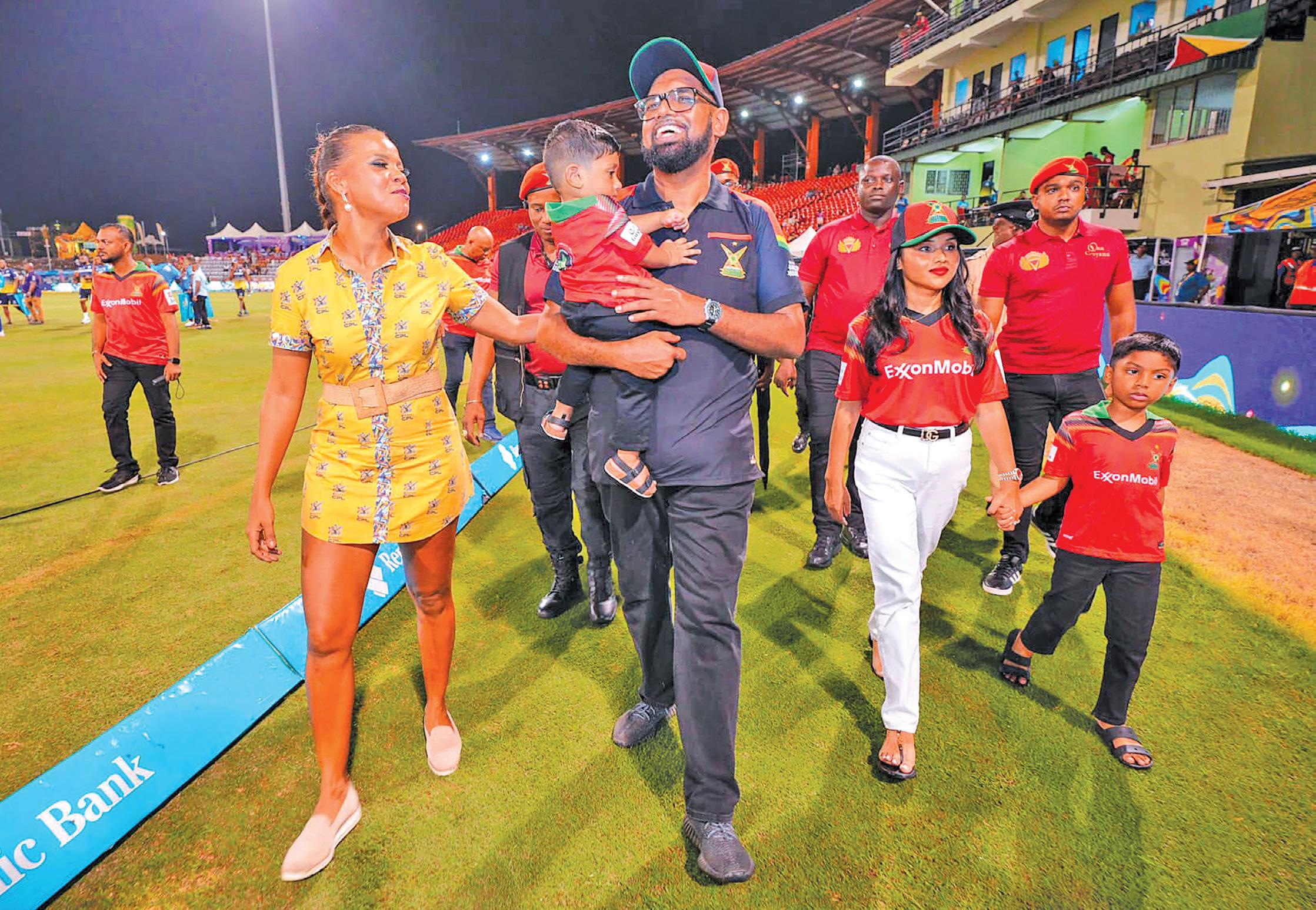 President Dr Irfaan Ali, who is accompanied by his family, shares a light moment with commentator Alex Jordon at the Guyana National Stadium, Providence, East Bank Demerara (EBD) on Sunday evening