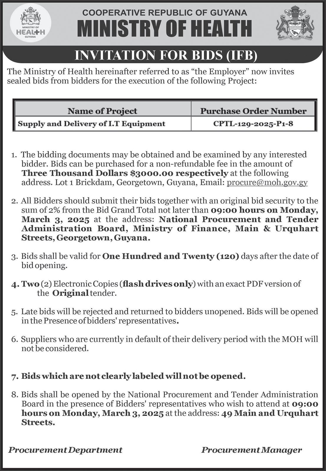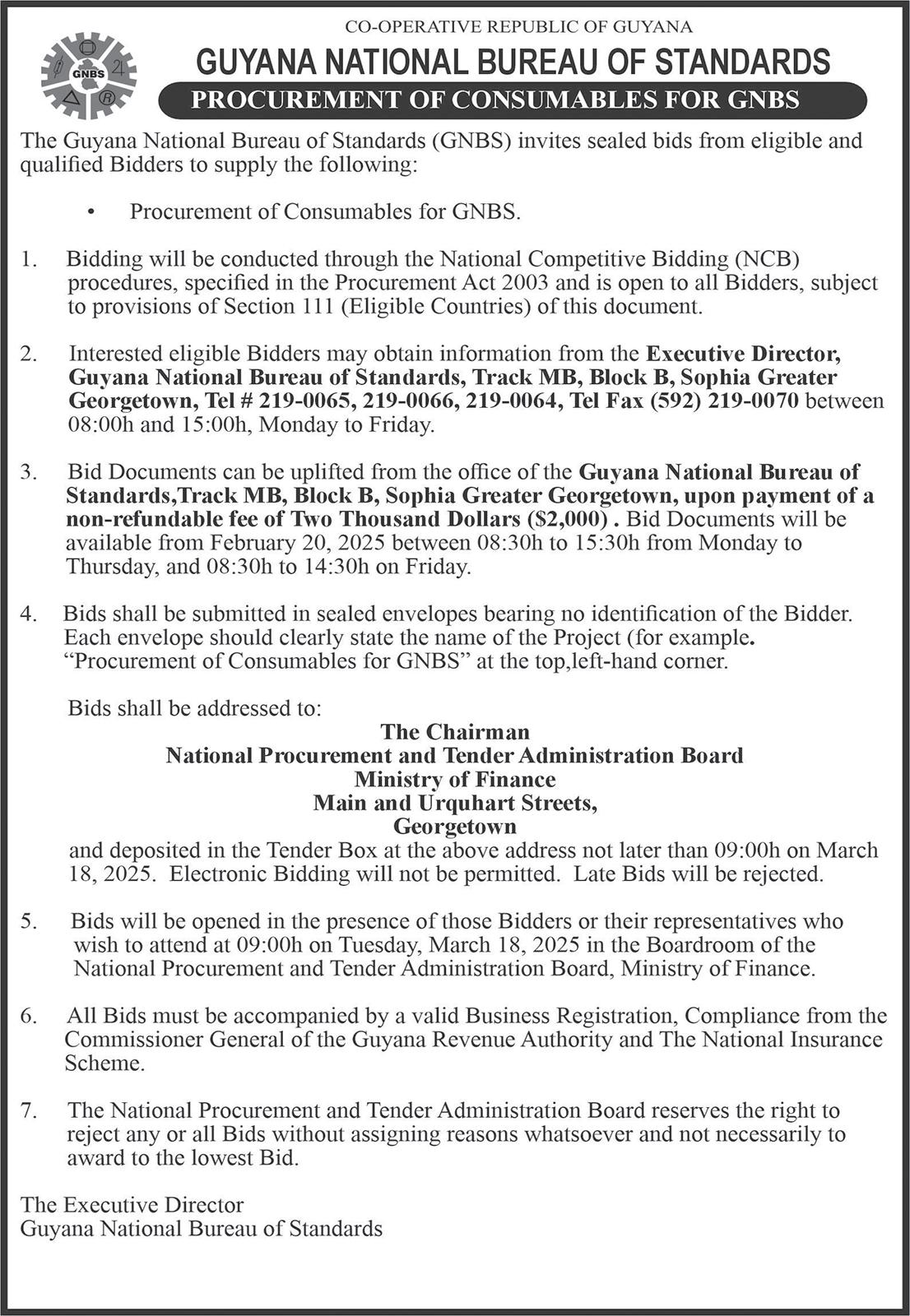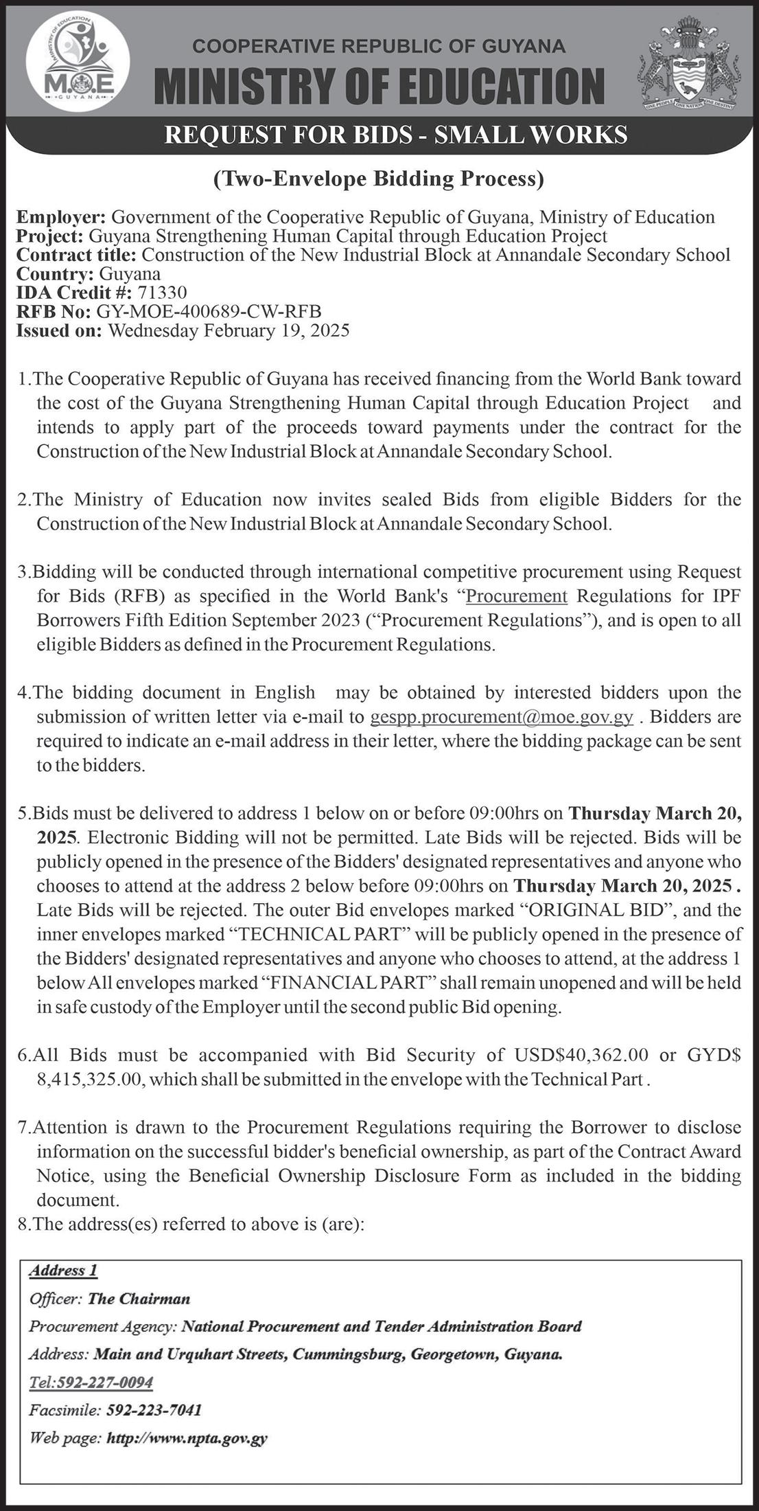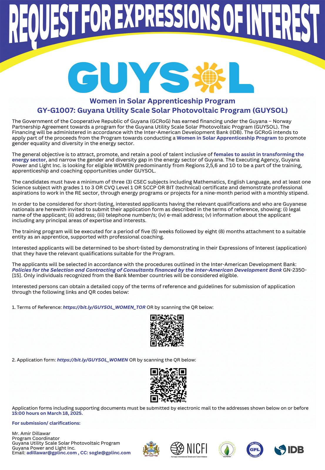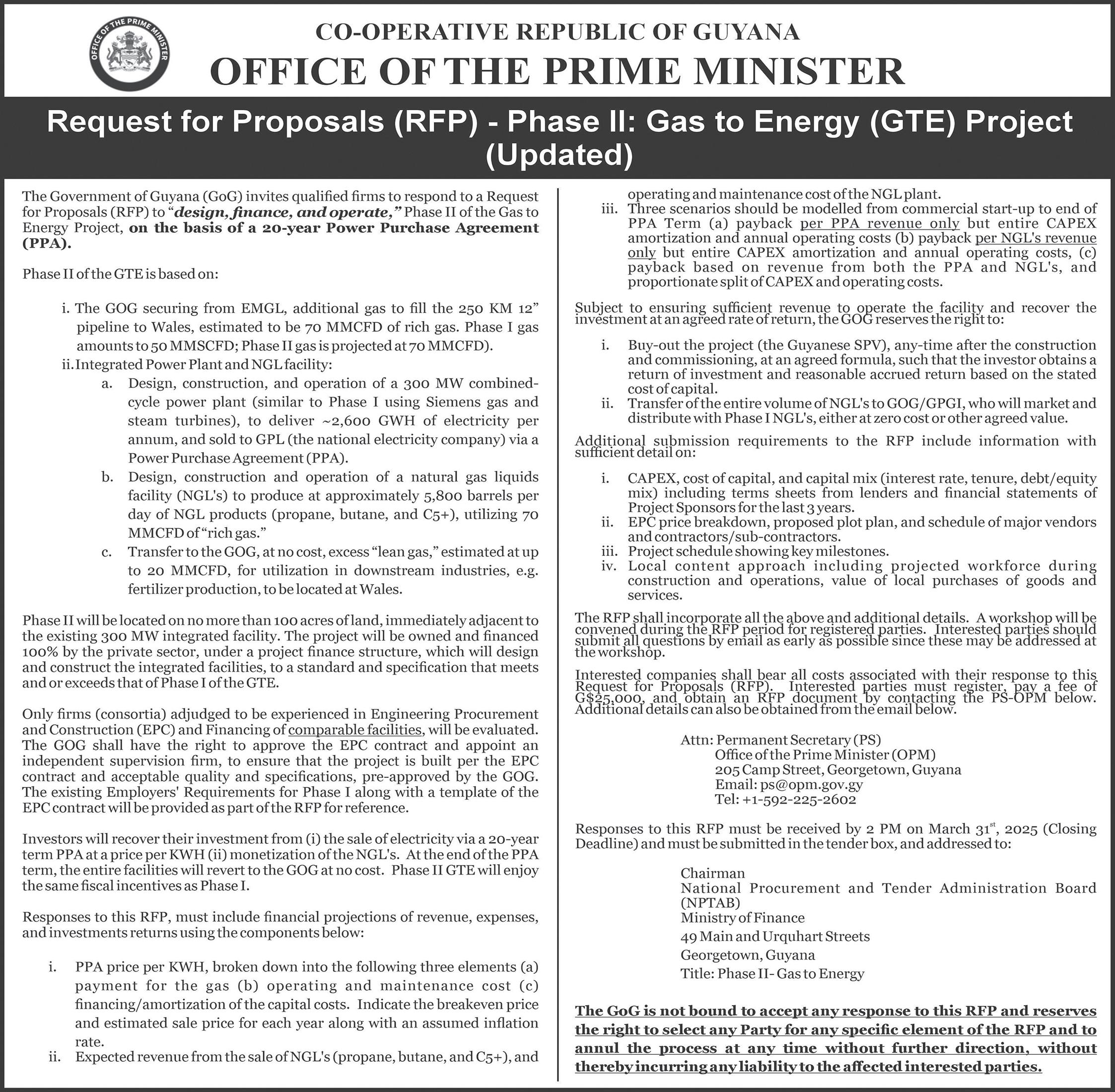 Invitations are currently open for proposals to design, construct, and operate a 250-megawatt (MW) combined-cycle power plant, capable of delivering 2,100 gigawatt-hours (GWh) of electricity per year, for sale to Guyana Power and Light (GPL) Inc.