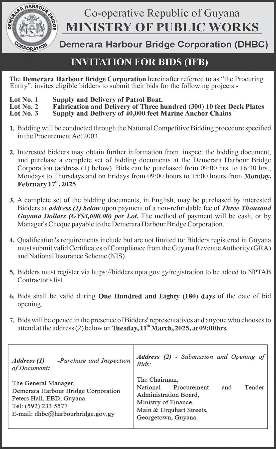 The Demerara Harbour Bridge will be closed to vehicular traffic on: