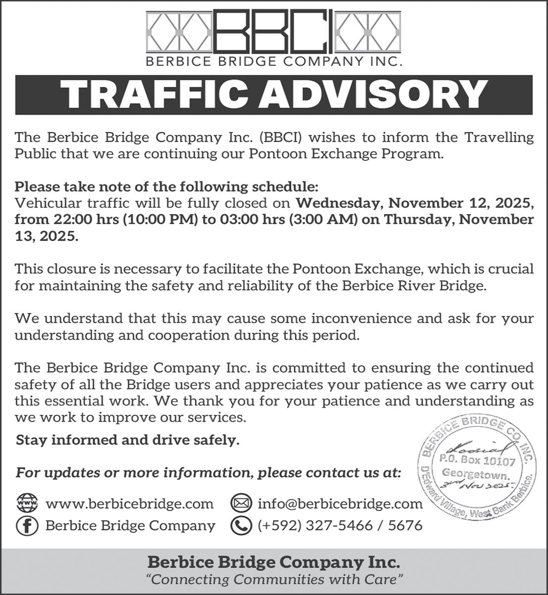 The Berbice Bridge will be closed to vehicular traffic on: Wednesday, November 5 –15:40h–17:10h and Thursday, November 6 – 16:35h–18:05h.