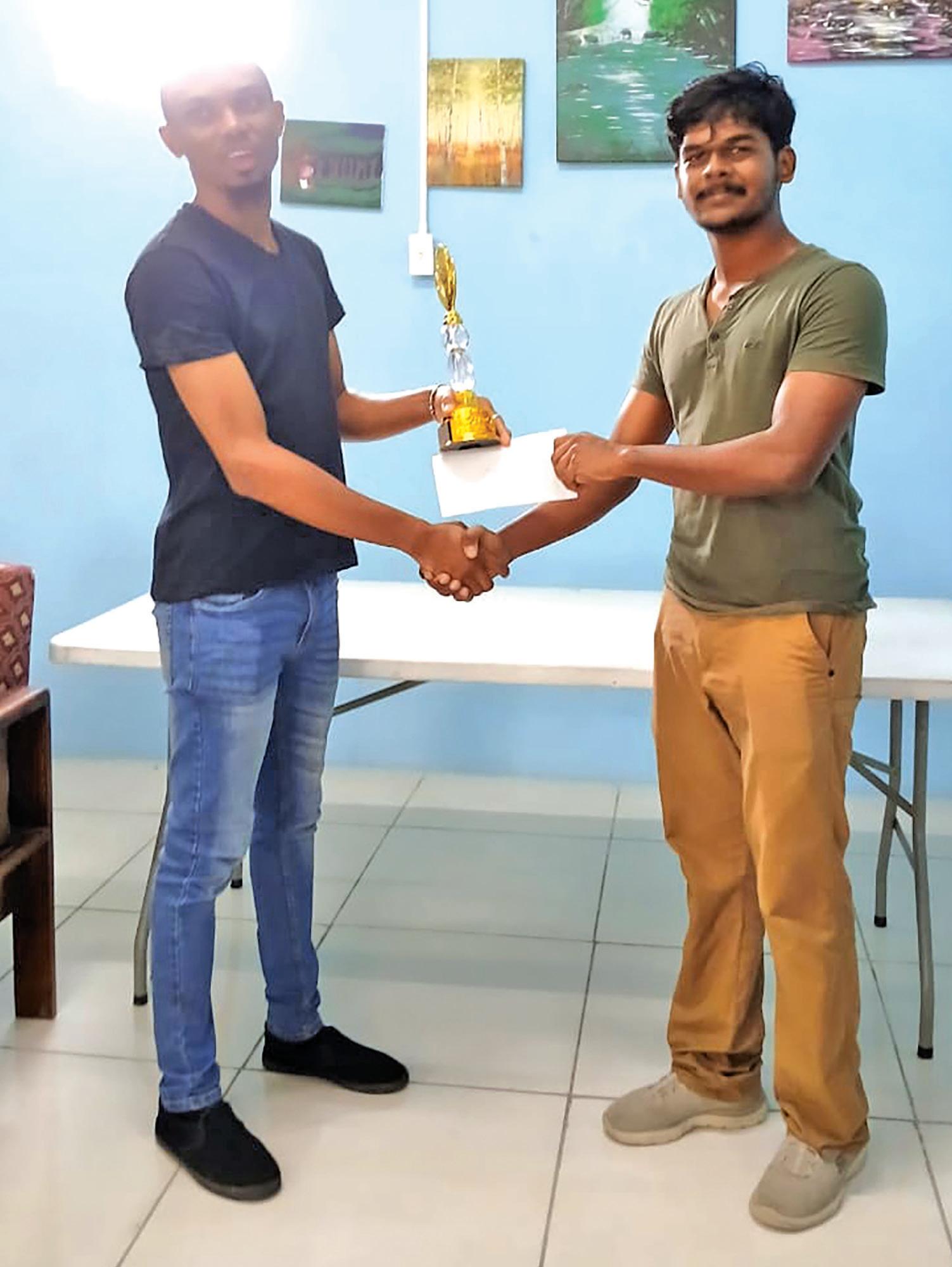 Reigning Junior Chess Champion Ricardo Narine (right) receiving his prize