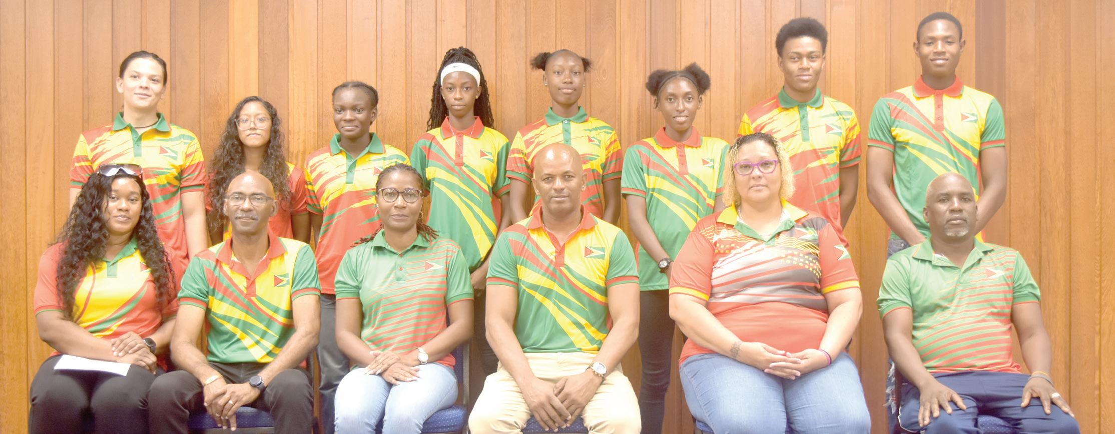 GOA President Godfrey Munroe (C), GOA Treasurer Godfrey Wiltshire, Coaches Julian Edmonds and Shyka Gonzalves, Team Manager Nalini McKoy and Physiotherapist Vanessa Wickham are flanked by athletes who will be representing Guyana at the Youth Commonwealth Games