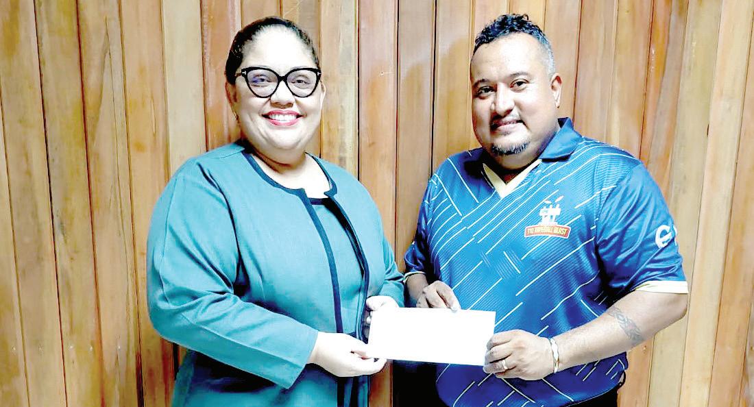 Dione Foo, Executive Assistant Property Manager of Gafoors, handing over a sponsorship to John Ramsingh of the Kares One Guyana T10 Blast