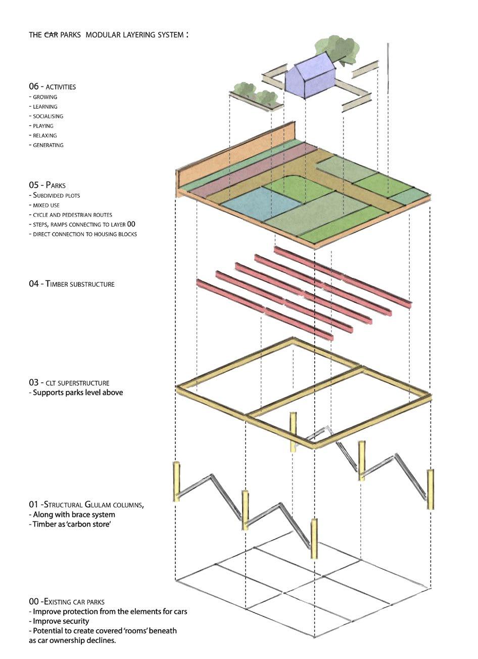 The superstructure is formed from laminated sterling board ribs and beams. These are created from 5 straight cuts from a 1220x 2440mm sheet and bolted together on site. In order to prevent exposure to weather the ribs are clad with a choice of pre-insulated panels to the walls and roof which can be finished in metal, timber, cork or fully glazed. This provides the home with its envelope, keeping it warm and dry whilst allowing each occupant to personalise the exterior of the building, perhaps adding greenhouse space, solar PV and rainwater collection.