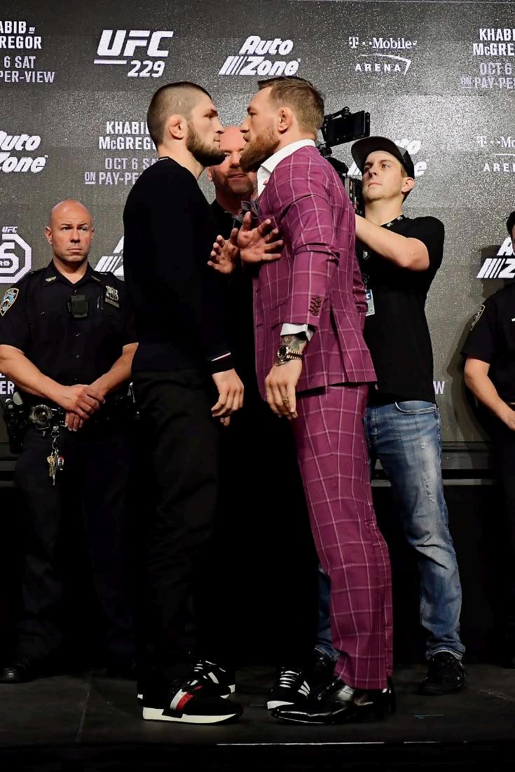 Ambos se enfrentaron en UFC 229, donde Khabib dominó el combate y ganó por sumisión en el cuarto asalto, manteniendo su invicto. Tras la pelea, el ruso saltó fuera del octágono y se desató una pelea entre ambos equipos, cerrando una noche caótica que consolidó esta rivalidad como una de las más recordadas en las artes marciales mixtas. THE WORLD IS