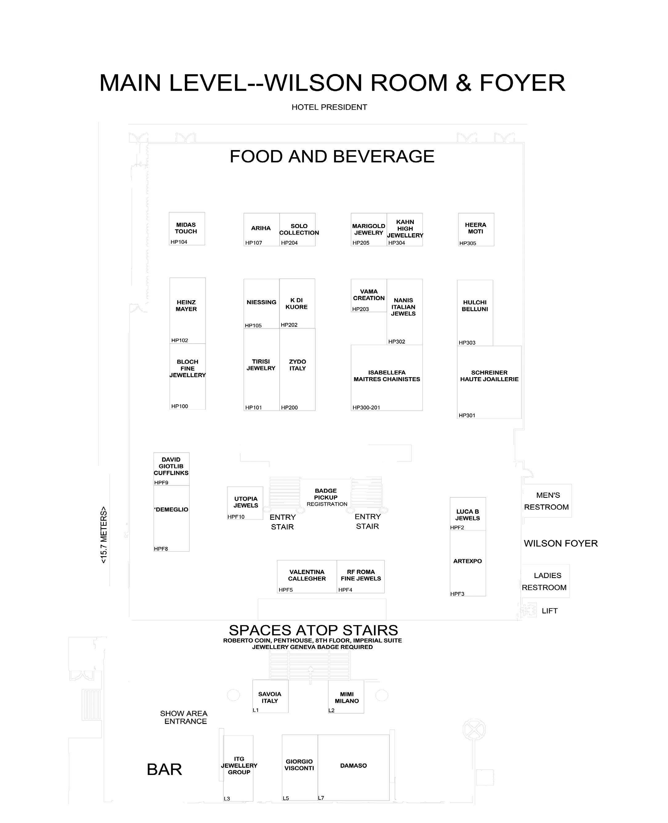 The JEWELLERY GENEVA SHOW takes place on the lobby level (just past the circular Glow Bar), in the Wilson Room Ballroom and Wilson Foyer, as well as in the Imperial Suite, on the 8th Floor (Penthouse) of the Hotel.