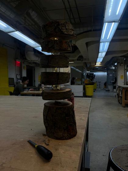Root & Light is a TA project I made in th woodshop that explores the relationsh between natural materials and light Th piece is made of stacked wood section showing the layers and growth of th material over time I added lighting between the pieces to highlight the gap and create a warm glow. The contra between the rough bark and the soft lig brings out both the raw and refine qualities of the wood, turning it into simplebutexpressivesculpturalobject