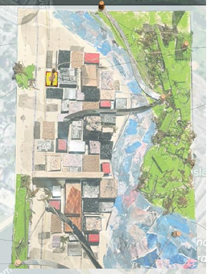 This collage of East Harlem combines textures and colors to depict buildings, green spaces, and water Geometric forms represent the urban layout, while organic materials highlight natural areas Bridges and pathways emphasize circulation, and the yellow-highlighted section marks afocalpointintheproject