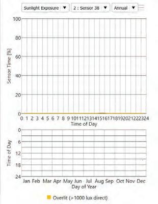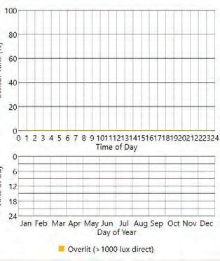 This iteration proposes to add to the previous iterations by introducing operable blinds with a transmission of 7.2%. The blinds are applied to all the glazed walls. As the blinds are operable, they completely eliminated the overexposed situations. This results in a ASE score of 0.6%.