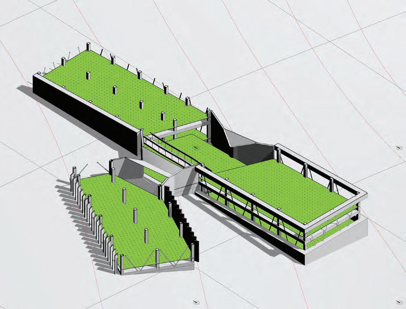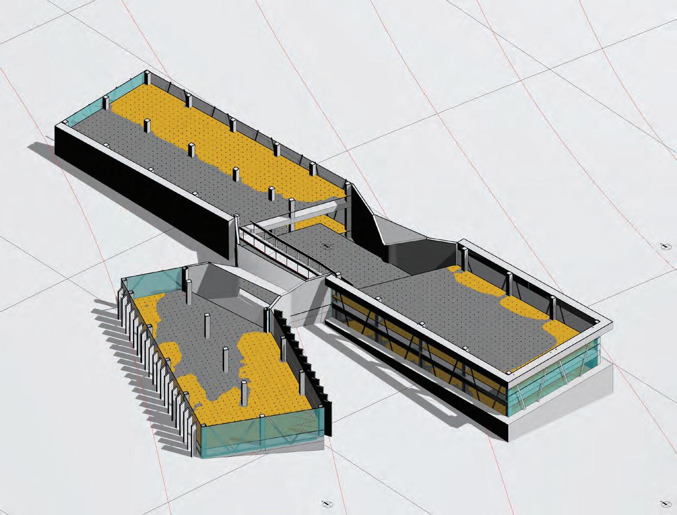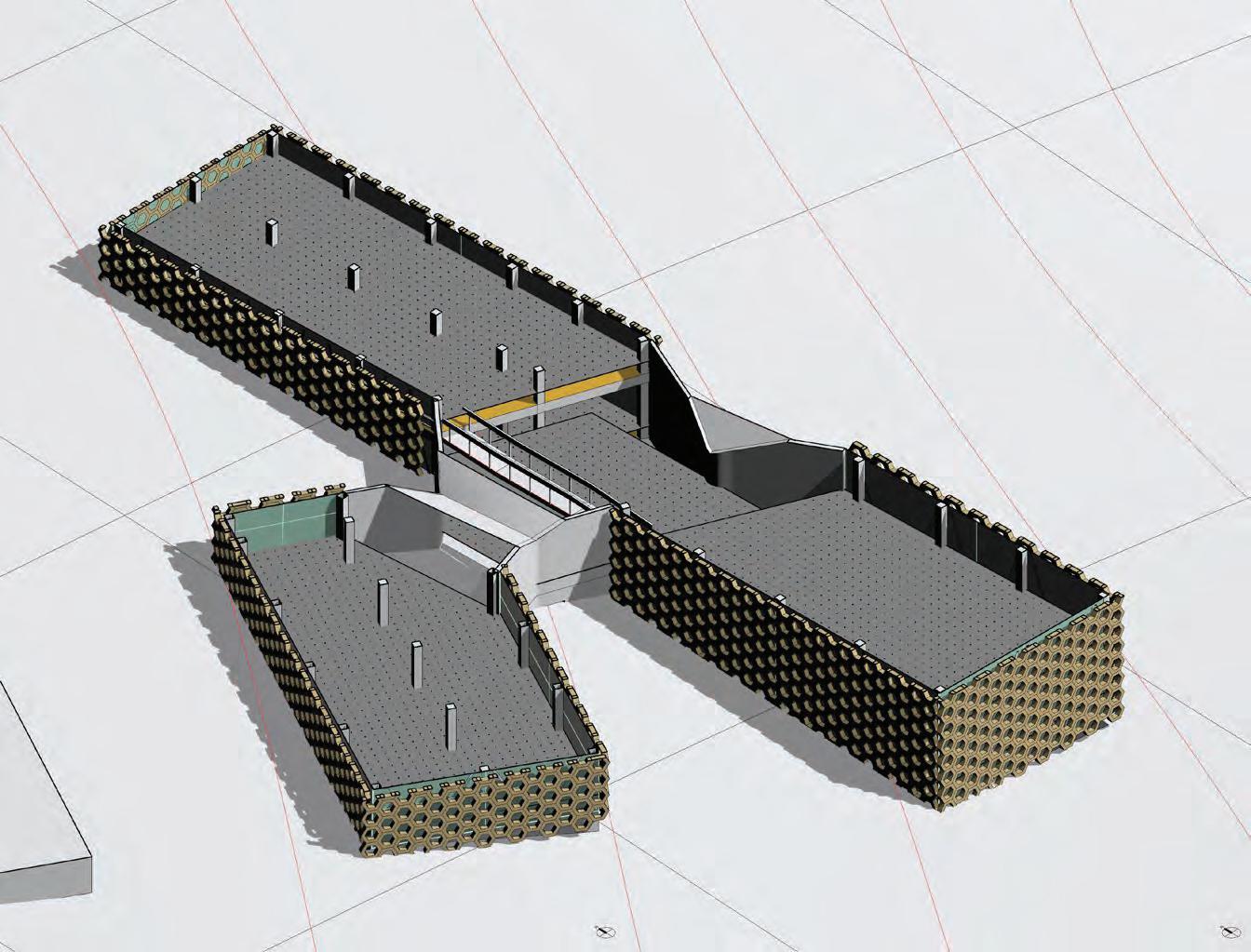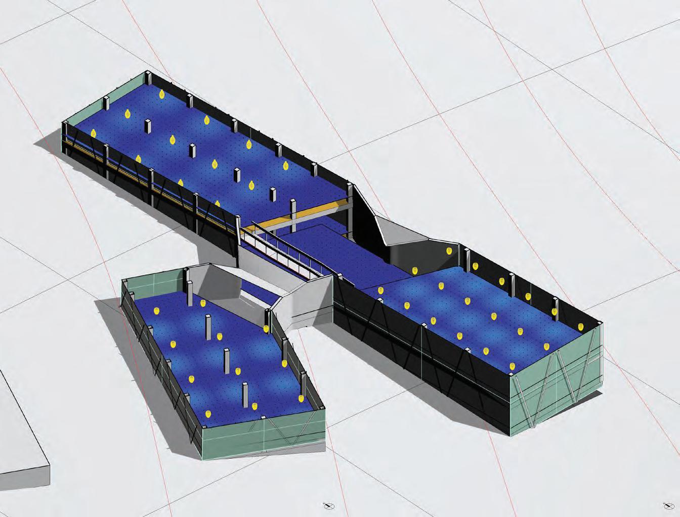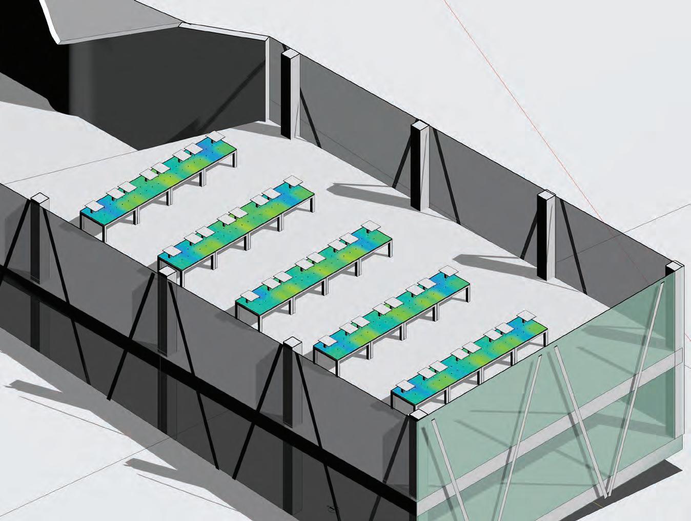 This iteration proposes the implementation of 3 different strategies to evaluate their efficiency in limiting glare while conserving the high daylight autonomy. The first strategy used is a series of louvers (4” x 10” x 16’) rotated by 20° from the facade to limit direct illumination. The second strategy are horizontal shades at the top & bottom of the glazed wall to limit higher sun angles light rays. The third strategy introduces a blind concrete wall to limit glazed surfaces and reduce the illumination. All strategies do not affect the daylight autonomy which remain above 99%.