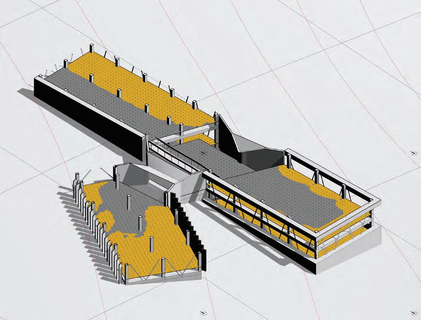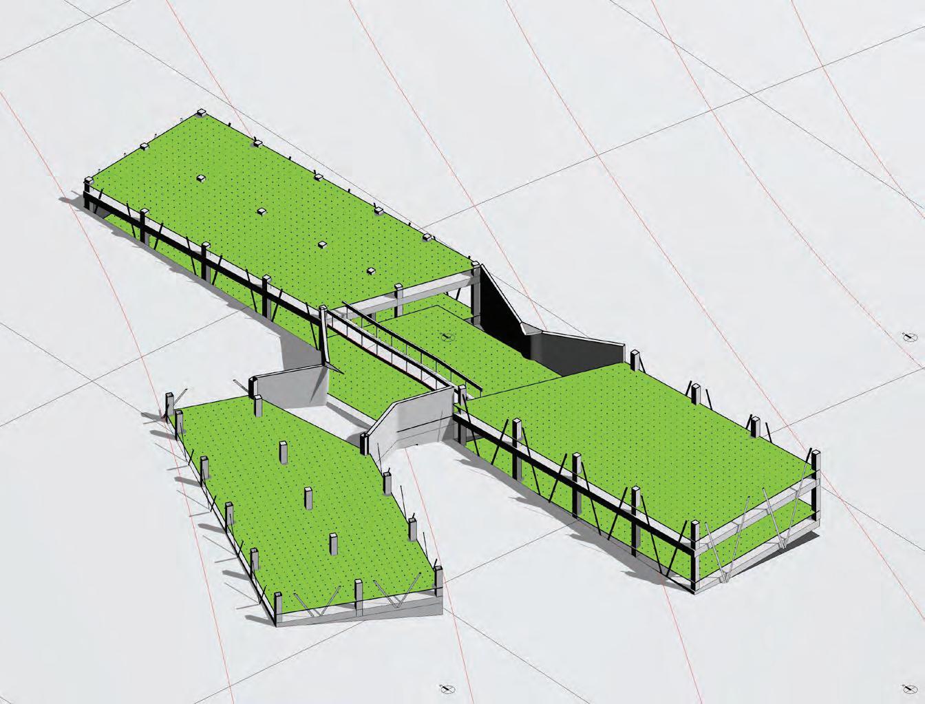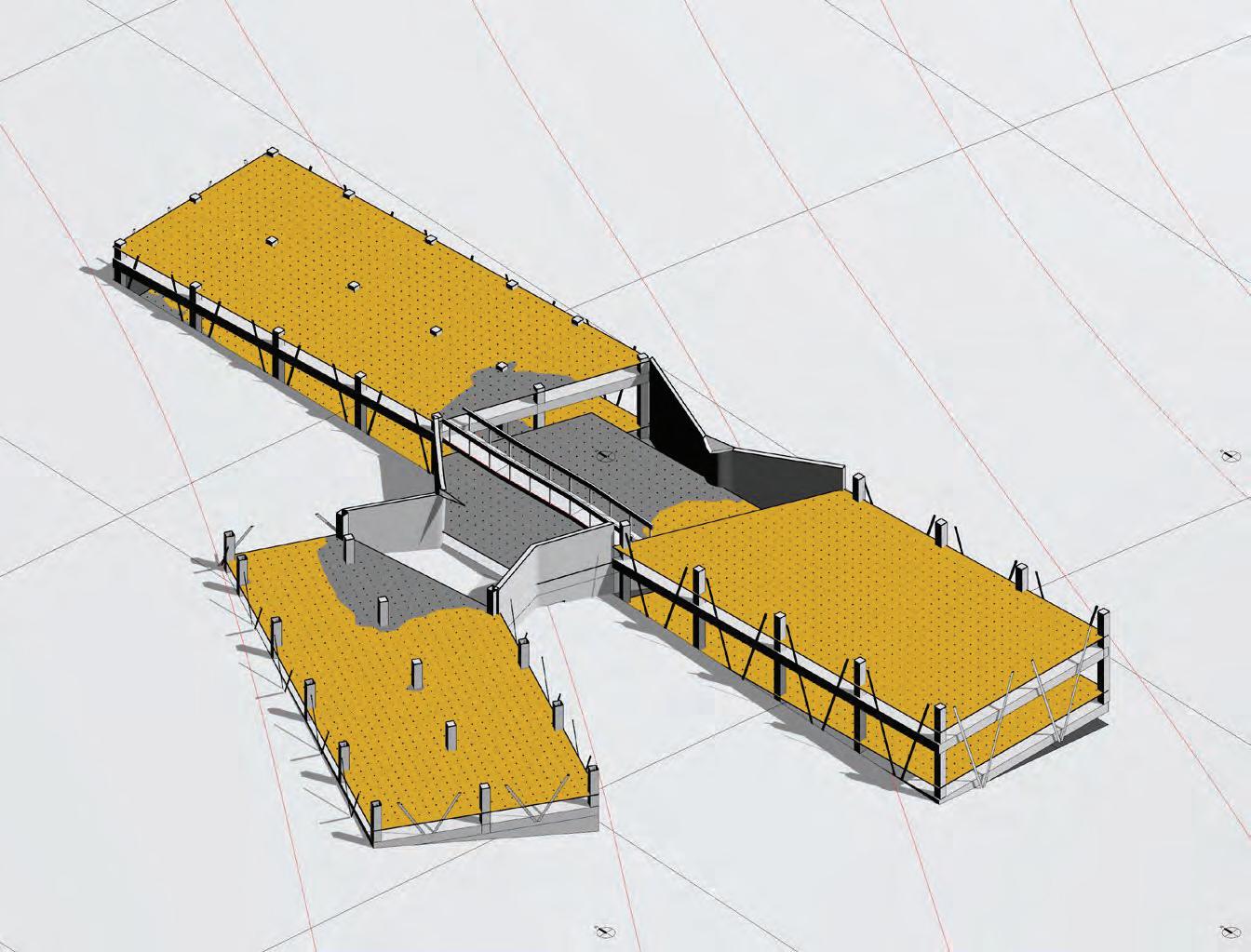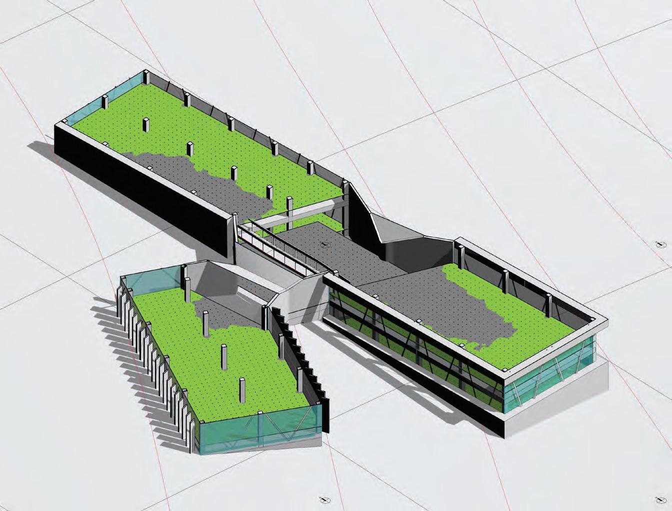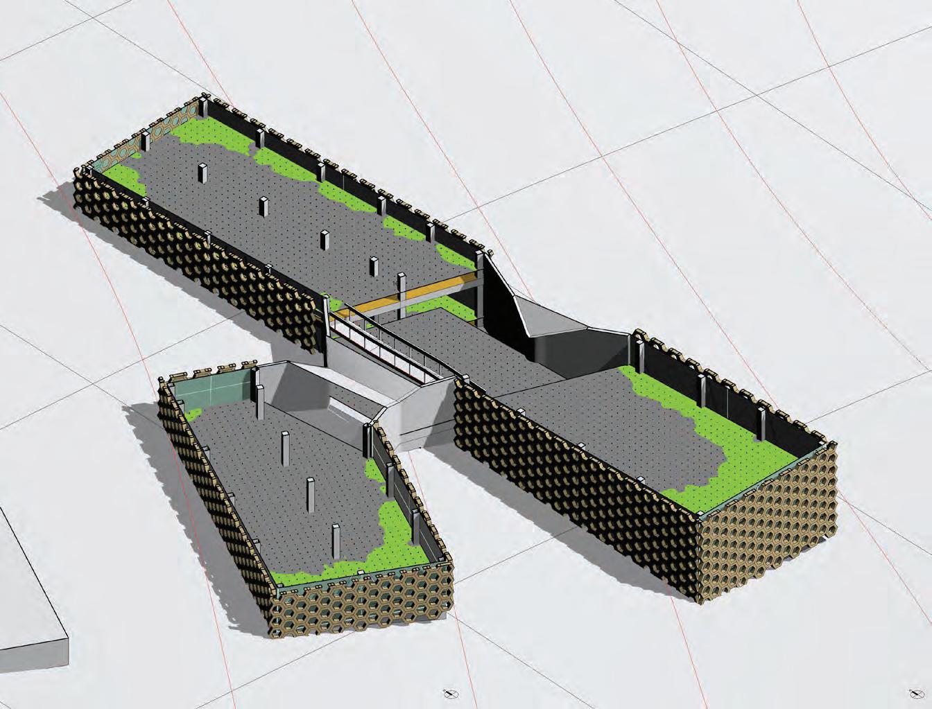 This iteration proposes the implementation of 3 different strategies to evaluate their efficiency in limiting glare while conserving the high daylight autonomy. The first strategy used is a series of louvers (4” x 10” x 16’) rotated by 20° from the facade to limit direct illumination. The second strategy are horizontal shades at the top & bottom of the glazed wall to limit higher sun angles light rays. The third strategy introduces a blind concrete wall to limit glazed surfaces and reduce the illumination. All strategies do not affect the daylight autonomy which remain above 99%.