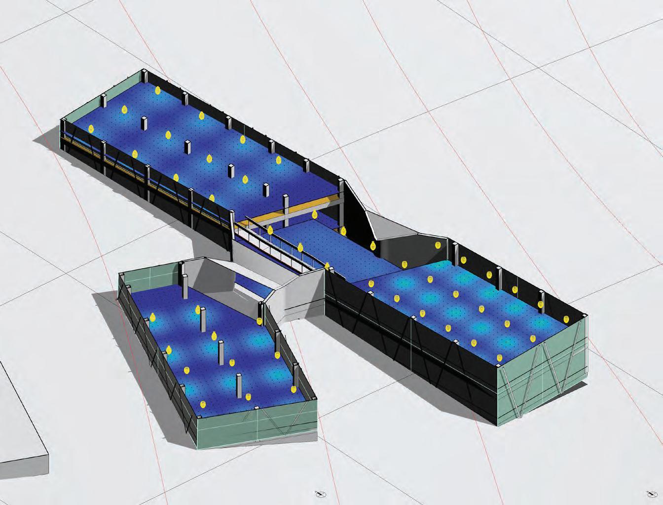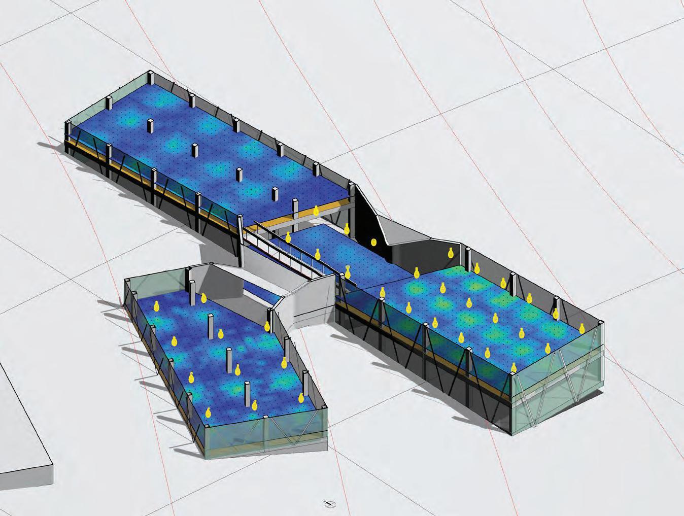 For this iteration, a new type of fixture including both downlight & uplight, have been implemented as pendant lum naires, and feature a power input of 69W. The combination of indirect and direct lightning should create a uniform lightning while providing high luminance through the downlights features. The mean luminance is now 380lux, and the median lux level is 328lux which is slightly above the requirements for the program. A remaining heterogeneity of light conditions persist due to the differences in ceiling heights.