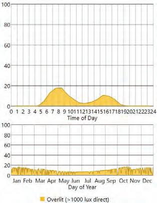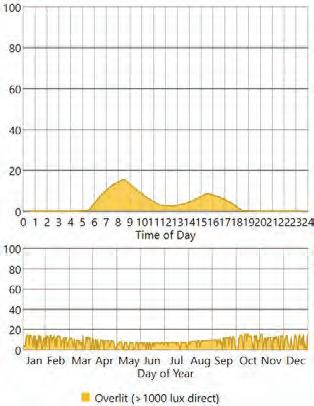 This iteration proposes the implementation of 3 different strategies to evaluate their potential efficiency to limit glare. All three strategies have an impact in reducing over-exposure situations, with an average over-exposure reduced to 46% The louvers are efficient in reducing glare on west-oriented surfaces, by preventing lower sun angles penetration in the afternoon. The horizontal shades limit the penetration of direct sunlight at the centre of the space, but have little effect on the spaces close to the glazed walls. Finally, the blind wall has a drastically reduces the over-exposure on a large portion of the adjoining space.