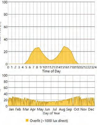 The initial design features large glazed facades providing high direct illumination levels, which can lead to mportant glare issues. As a result, the average ASE score is superior to 79%, with a majority of the servant spaces being concerned by this issue.