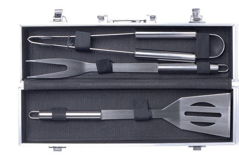 Set mit vier Zubehörteilen aus rostfreiem Stahl mit Holzgriff: Messer, Tranchierer, Pinzette und Spatel. Ergänzt durch ein Schneidebrett aus Holz. Verpackt in einem Etui aus recyceltem RPET-Polyester. Ideal als Geschenk bei Firmenfeiern, für Mitarbeitende oder als Kundenpräsent.