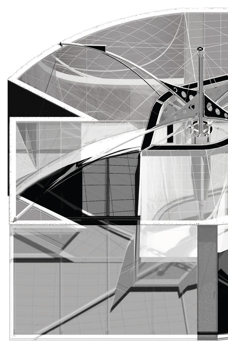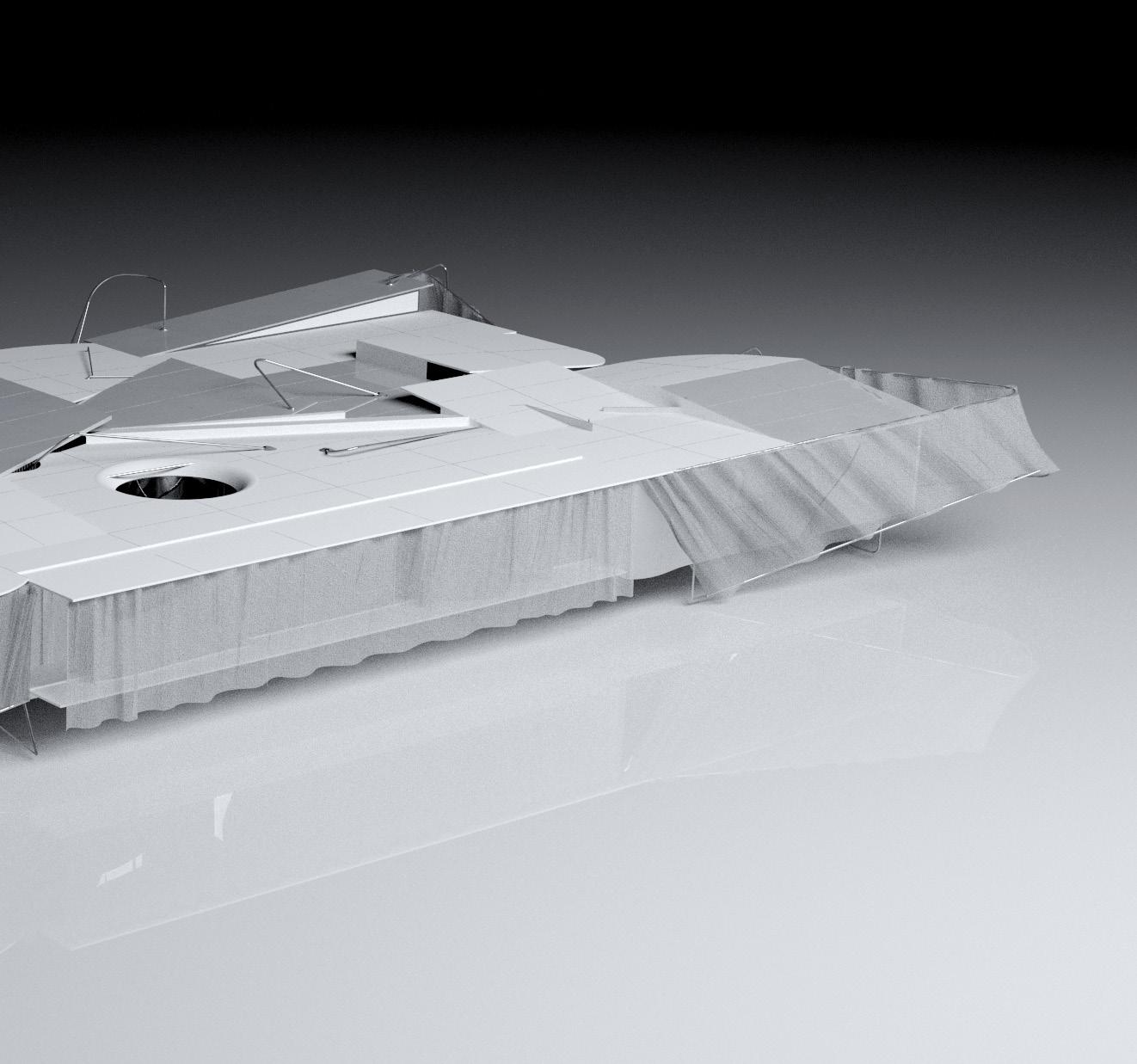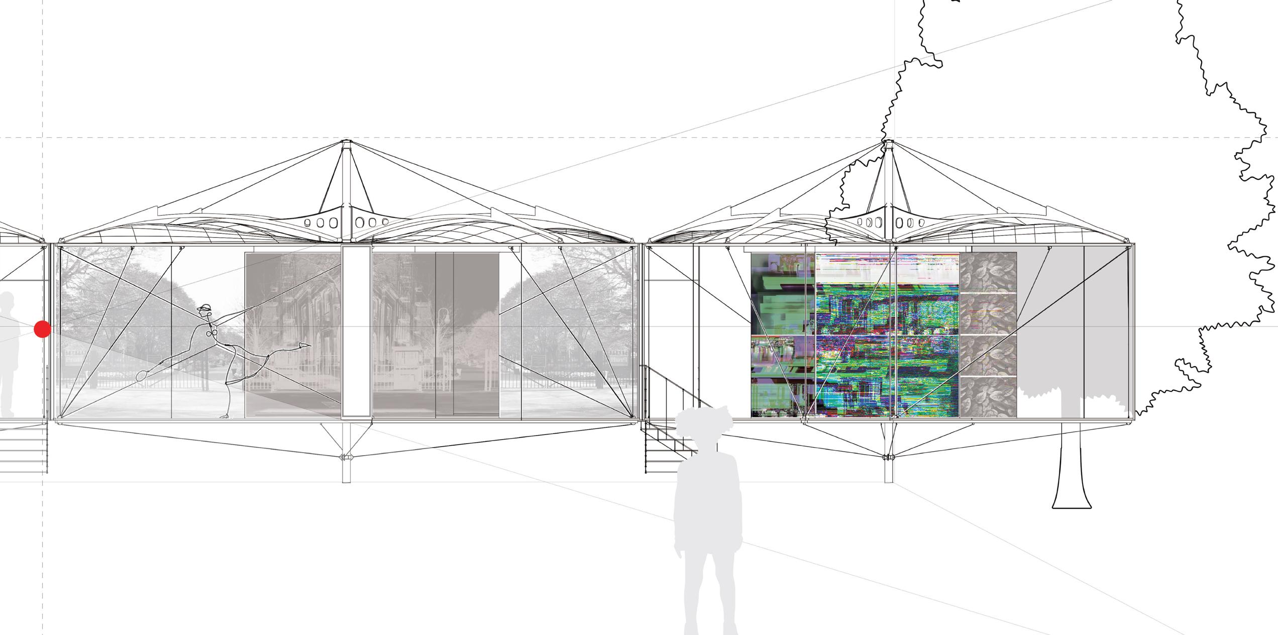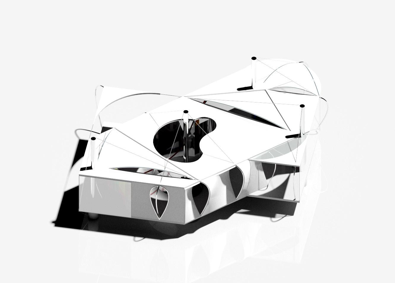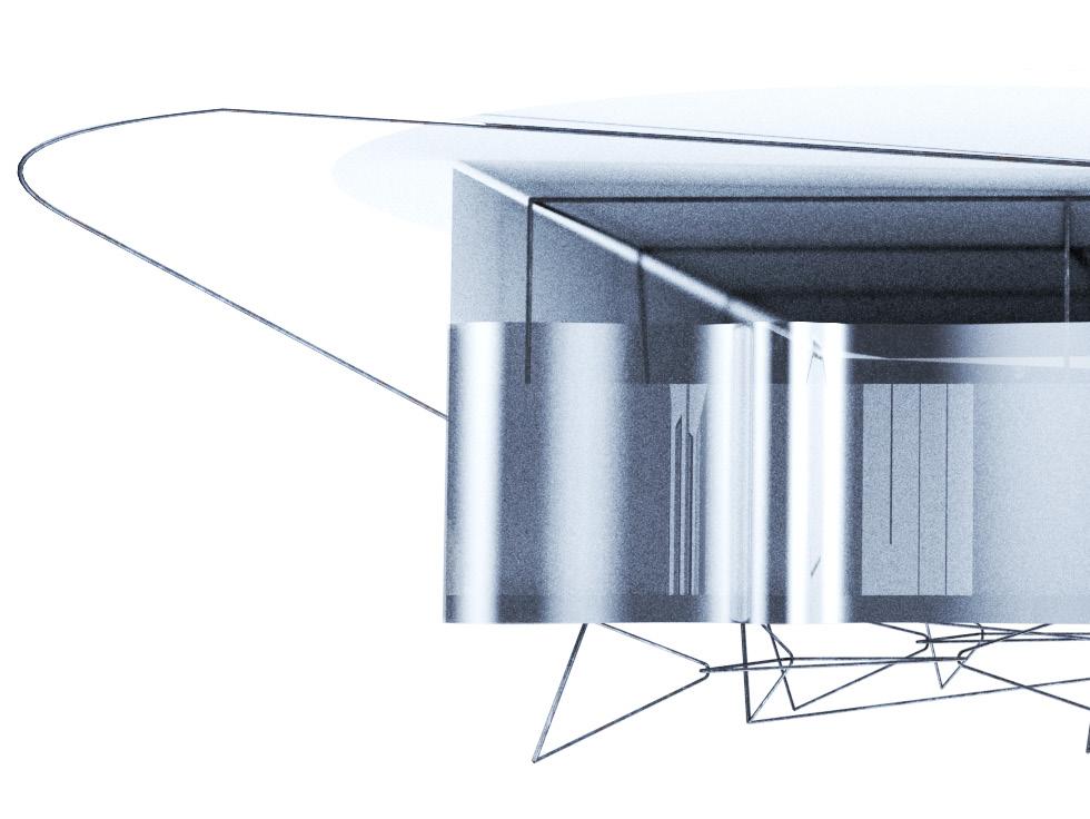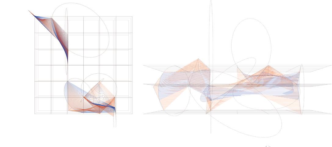 The deformation of reflective surfaces creates a virtual extension by distorting space and redefining boundaries. Obscured edges generate constant spatial fluctuations, resulting in a phenomenological spatial extension condition. Interweaving rods—erratic, dynamic, and seemingly spontaneous in their path—act as trajectories of the planes, echoing the lines in Jackson Pollock’s paintings—tracing the movement of the artist. In this architectural proposition, transparent planes function as afterimages of the solid planes in motion, leaving behind a residual trace of their trajectory.