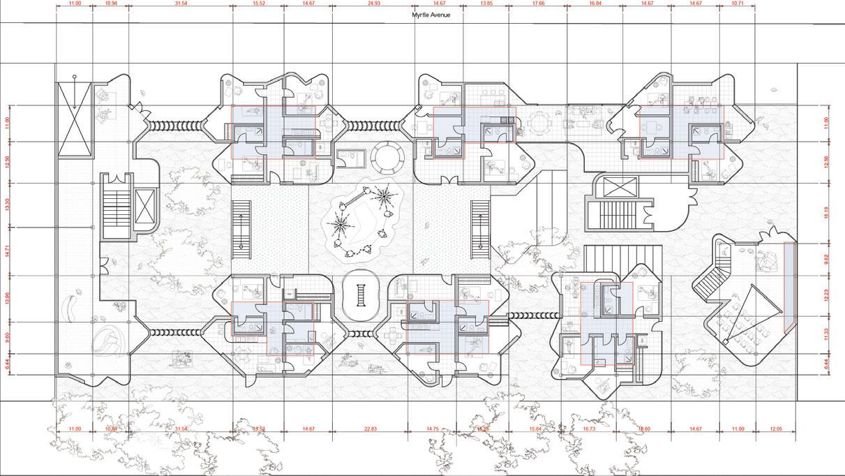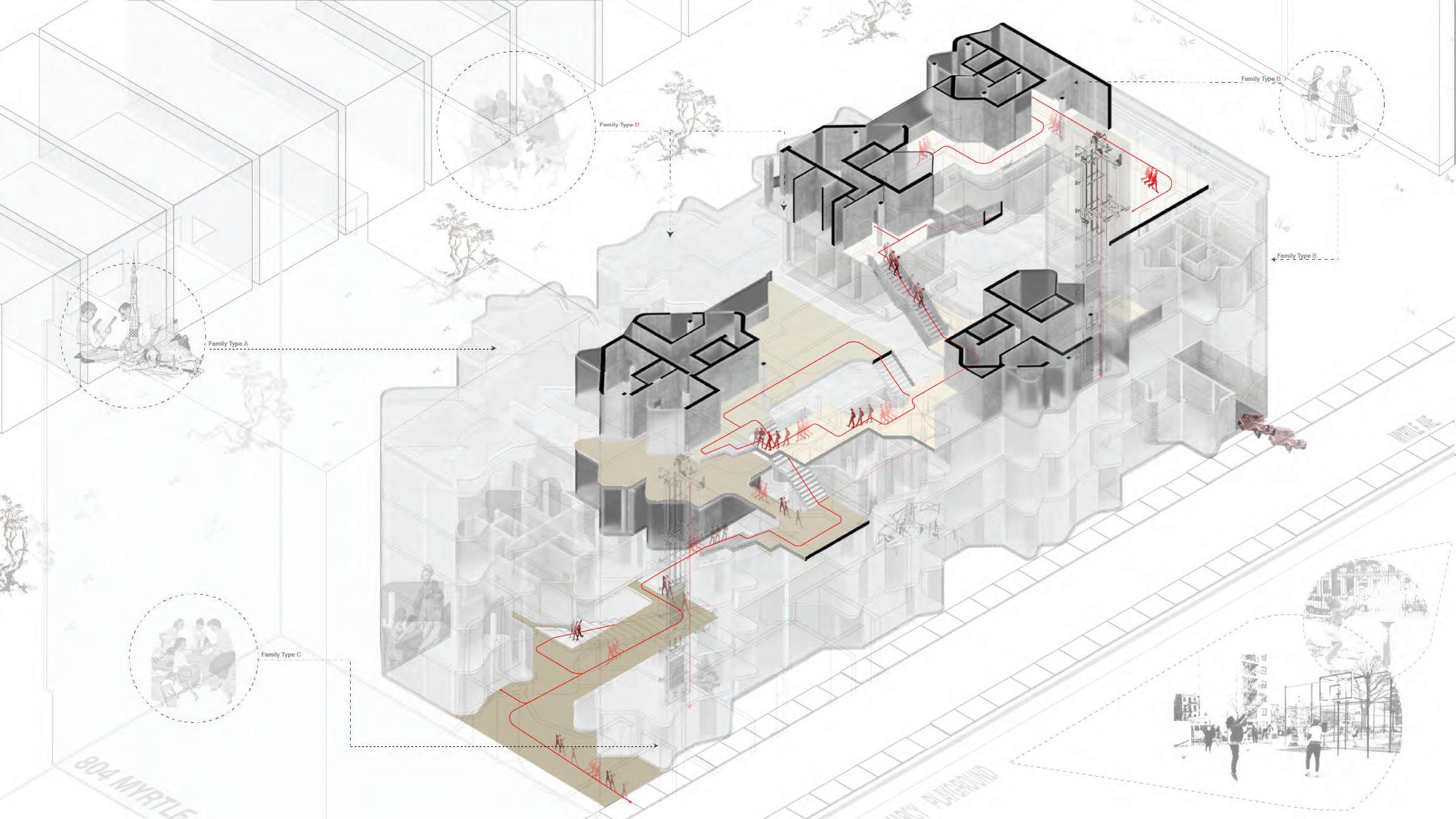 The project reimagines co-housing for multiple generations, providing 96 versatile family units at 784 Myrtle Avenue. This location serves a distinctive Brooklyn demographic with higher concentrations of single parents and elderly residents than borough averages. Positioned strategically near educational institutions ranging from high schools to colleges, the project accommodates diverse housing needs within a single cohesive development.