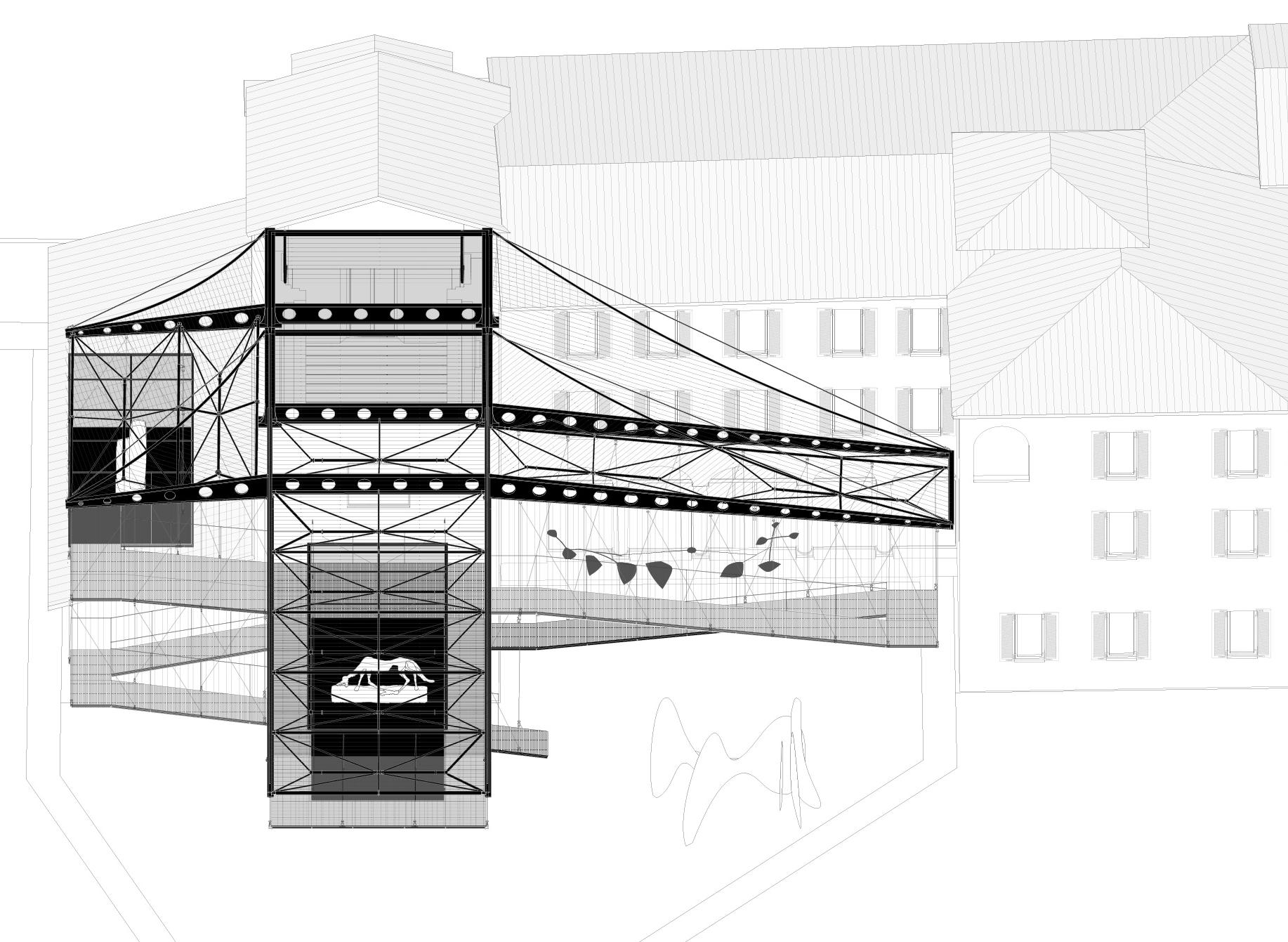 The architectural approach emphasizes a lightweight structural system to support floating glass volumes and cantilevered roof canopies. In deliberate contrast to the monolithic solidity of the historic walls, the new structure prioritizes lightness and transparency, reinforcing its temporal and ephemeral character.