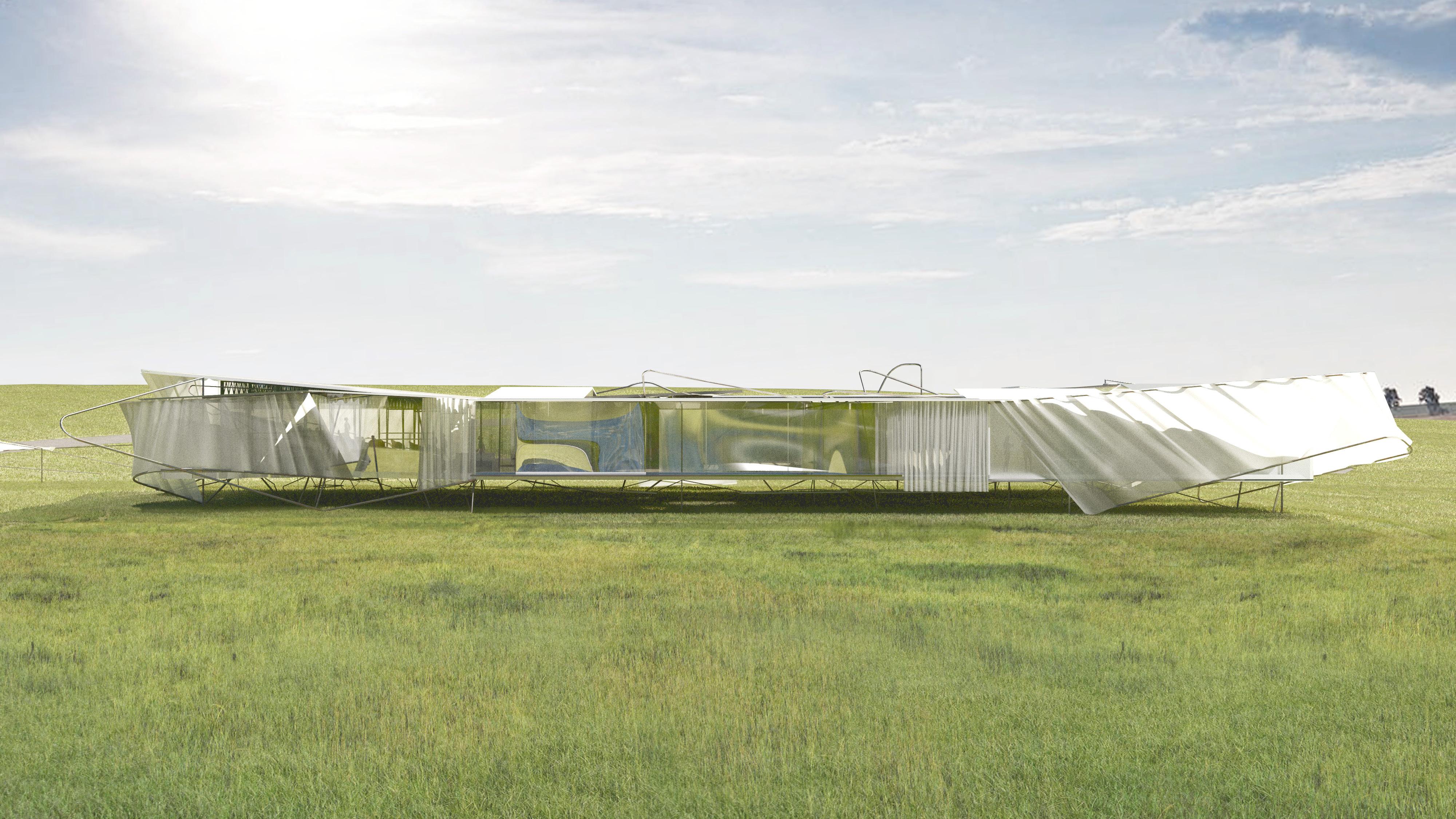 During floods, the “wave of the wall” submerges while the “wave of the roof” appears to float like an island. A bridge connects this island to man-made ground on the east, where a circular cutout serves as gathering space in normal conditions but becomes a lake during floods. The project metaphorically embodies natural elements—earth, water, and island—in its responsive design.