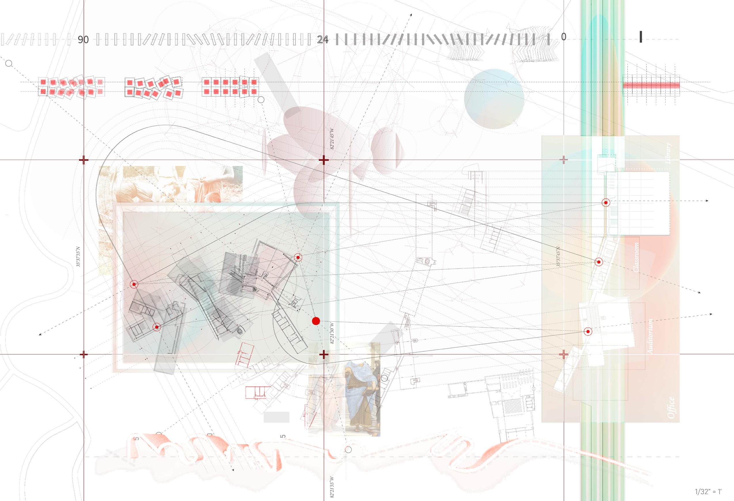 In reimagining Black Mountain College, the aim is not to recreate a fixed past, but to activate a living process—one that acknowledges “both presences and absences,” and “depends on the erasures in order to present itself.”¹ This approach parallels Eisenman’s artificial excavation methodology, where architectural meaning emerges through the deliberate layering, revealing, and concealing of traces. The school becomes a site of layered educational history—a place