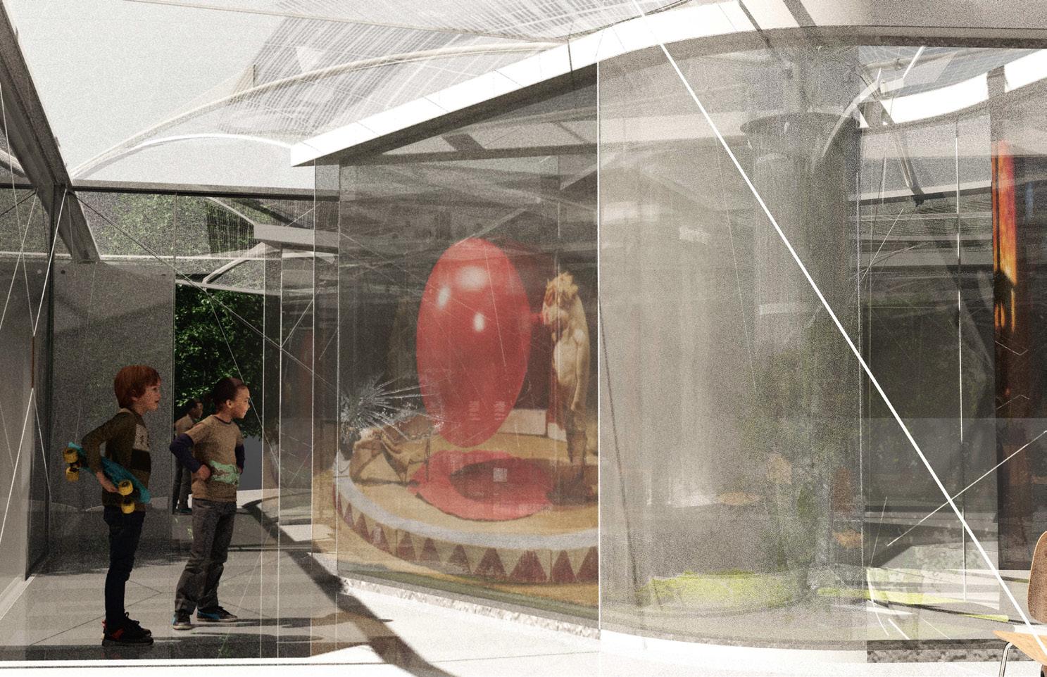 The floating glass volumes serve as elevated exhibition spaces, creating a network of interconnected galleries accessible via a continuous ramp that weaves from the ground plane to the upper levels. These volumes redefine the facade of the historic architecture as an exhibit in itse lf, offering visitors layered visual and spatial experiences at varying heights.