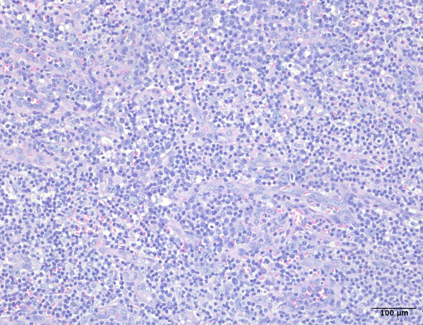 2. Characteristic histopathologic findings of Castleman disease. Hematoxylin and eosin image showing an expanded paracortex with hyaline vascular proliferation and increased plasma cells.