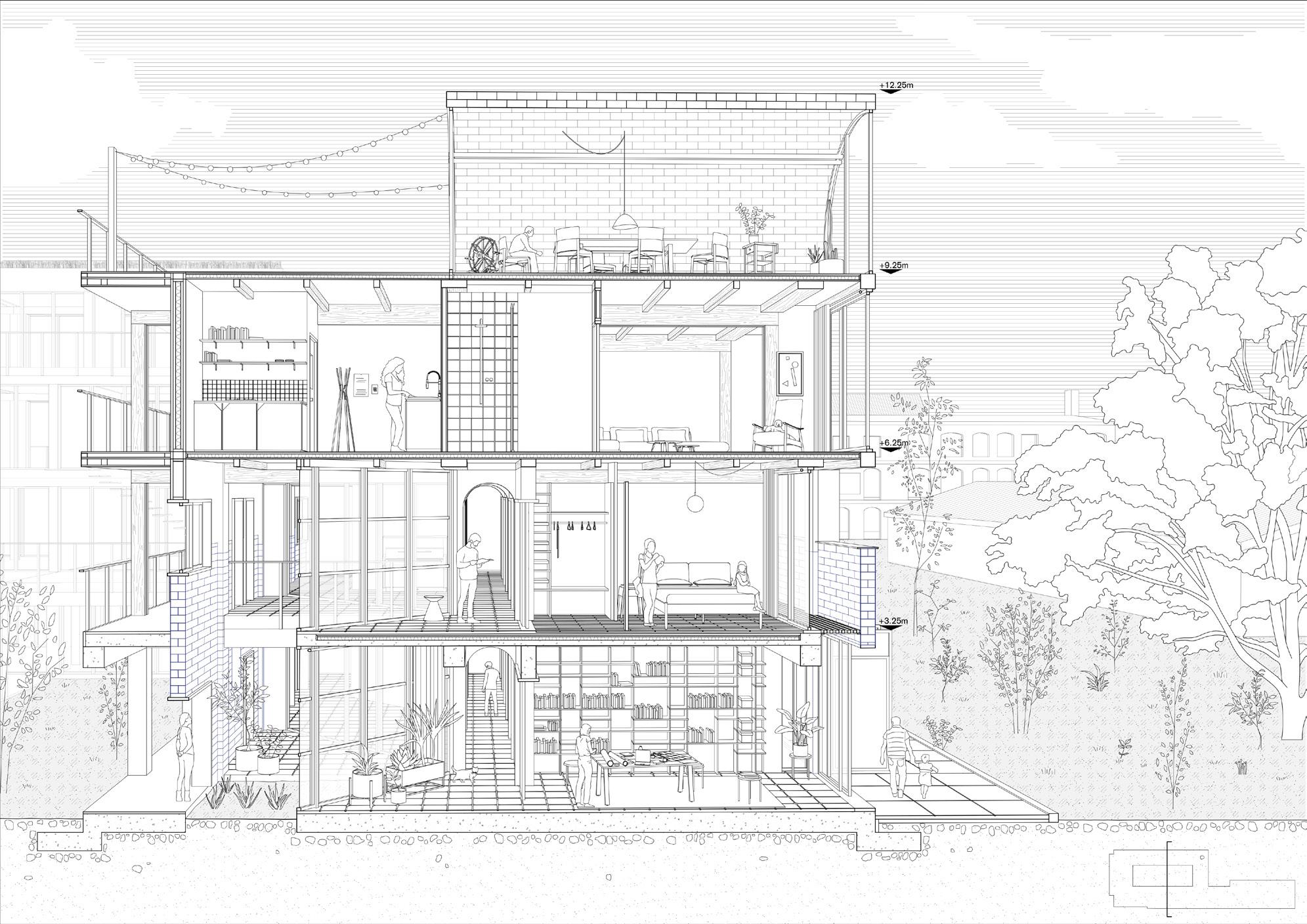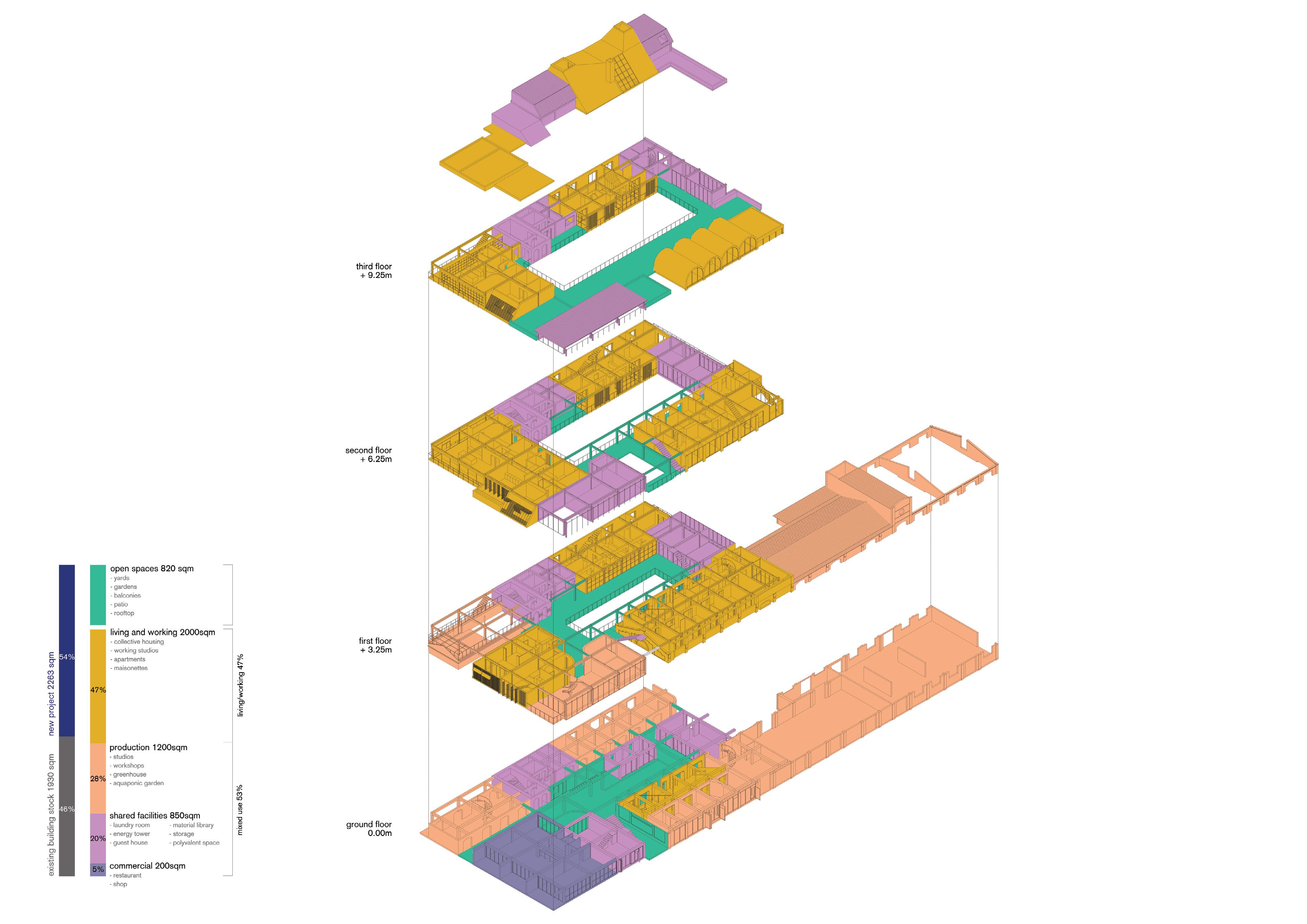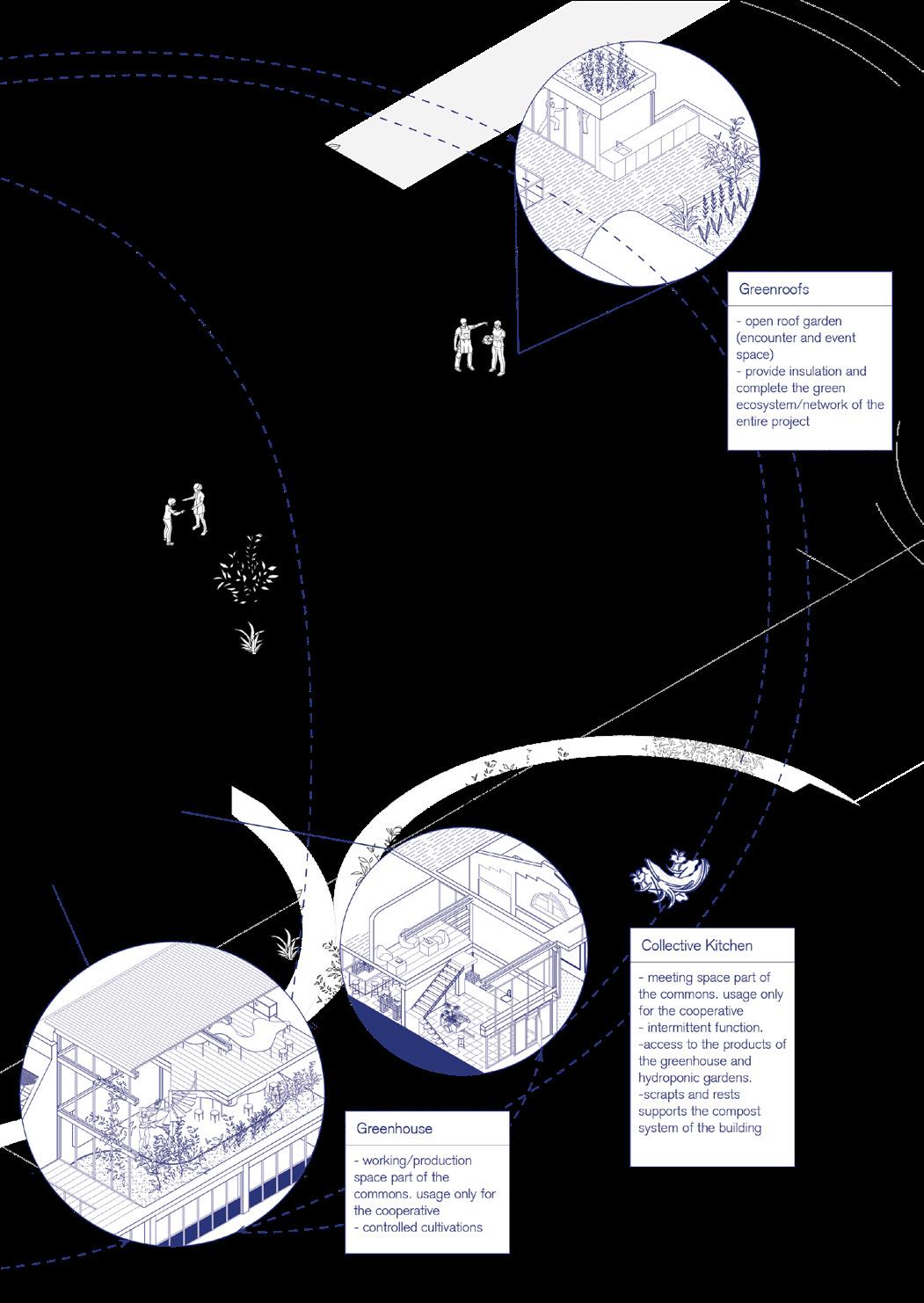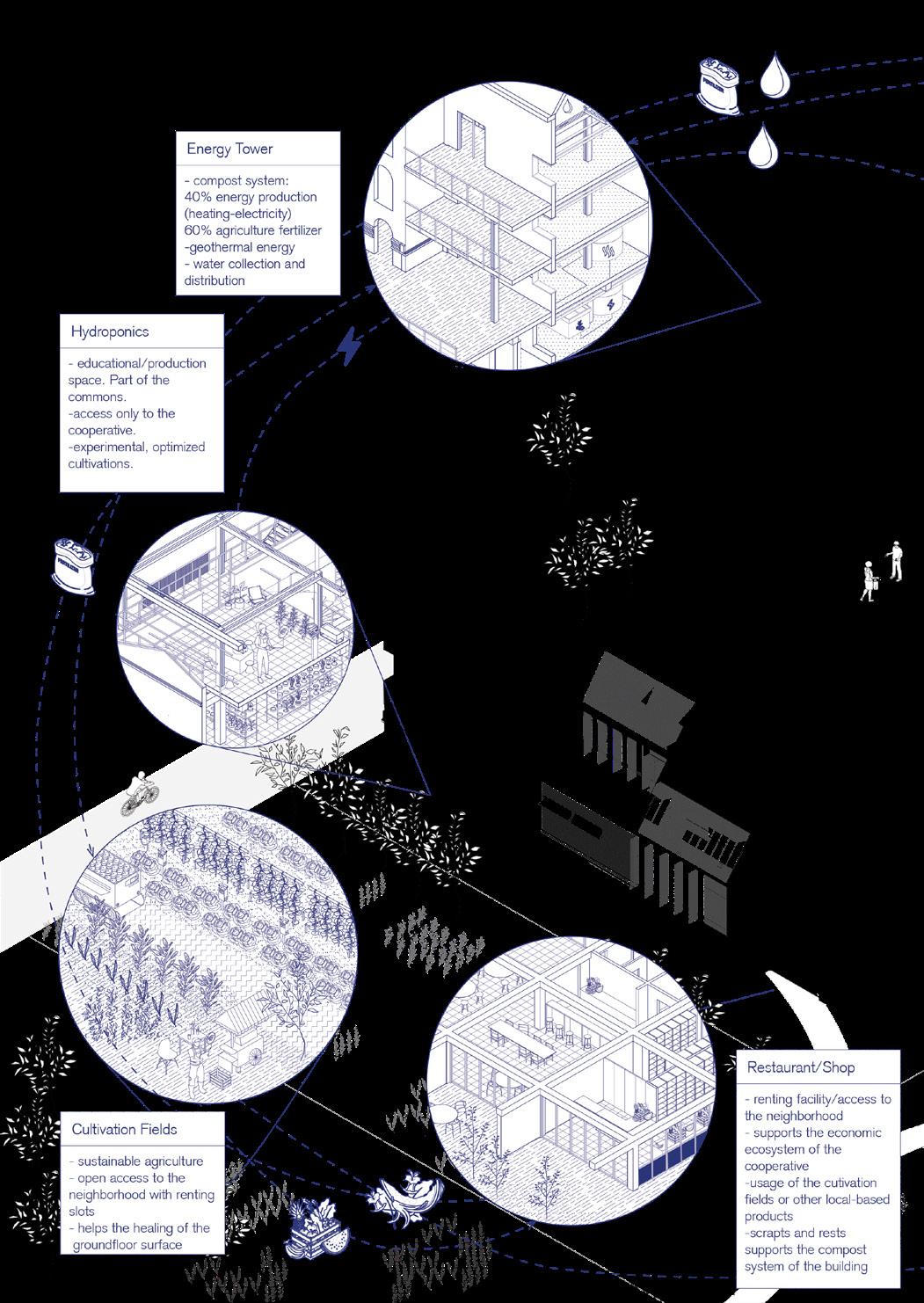 To test this idea, they introduced an experimental prototype for a mixeduse cooperative with an alternative ownership model based on collectivity and participation, and localizing the material resources. After a prototyping and research phase which lasted until 2025, the group developed this vision further by utilizing a digital platform to spread their goals and strategies to grow their community. They formed a building cooperative among the members to be in charge of the project construction in the premises.