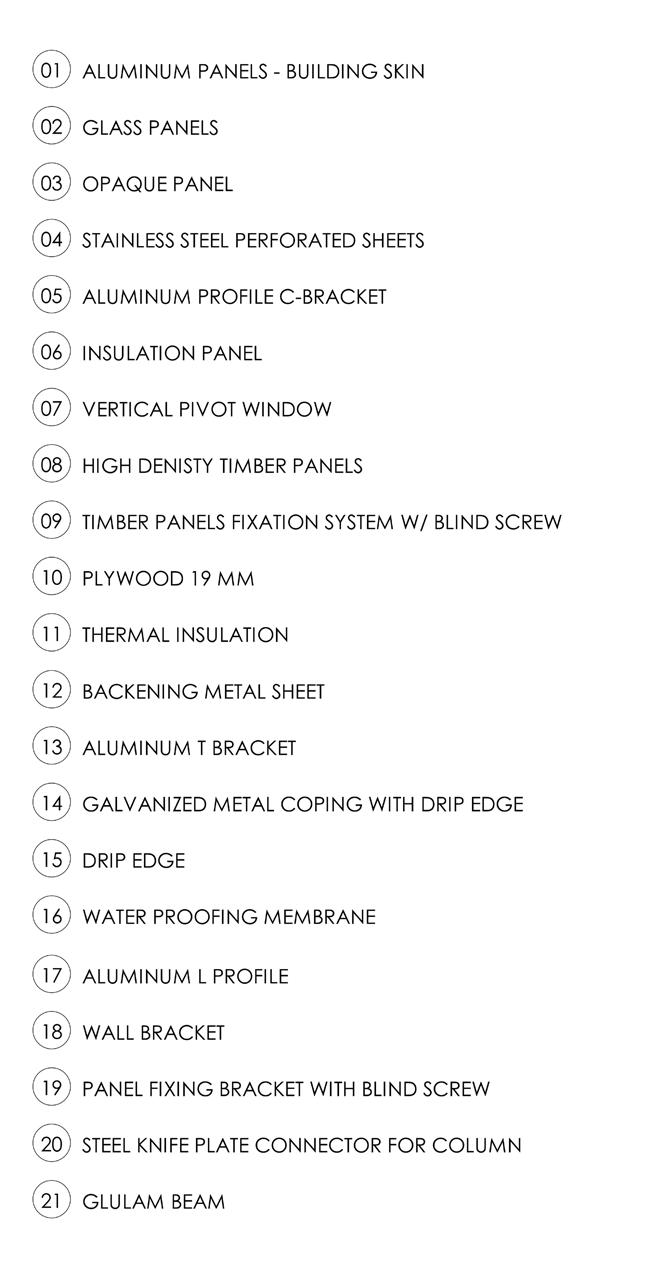 GIACOMO BOFFI GIAN LUCA BRUNETTI MARCO SCAIONI SUSTAINABLE CONSTRUCTION STUDIO ATELIER HTCM PROFESSORS FACADE DETAILS PANEL 13 01 02 03 04 05 06 06 07 07 11 10 14 13 13 3.10 3.10 15 12 16 01 ALUMINUM PANELS - BUILDING SKIN 02 GLASS PANELS 03 OPAQUE PANEL 06 INSULATION PANEL 05 ALUMINUM PROFILE C-BRACKET 07 VERTICAL PIVOT WINDOW 08 HIGH DENISTY TIMBER PANELS 04 STAINLESS STEEL PERFORATED SHEETS 09 TIMBER PANELS FIXATION SYSTEM W/ BLIND SCREW 10 PLYWOOD 19 MM 01 02 03 04 05 06 08 09 10 11 11 THERMAL INSULATION 12 BACKENING METAL SHEET 12 07 13 ALUMINUM T BRACKET 14 GALVANIZED METAL COPING WITH DRIP EDGE 15 DRIP EDGE 16 WATER PROOFING MEMBRANE 17 ALUMINUM L PROFILE 19 PANEL FIXING BRACKET WITH BLIND SCREW 18 WALL BRACKET 20 STEEL KNIFE PLATE CONNECTOR FOR COLUMN 21 GLULAM BEAM 01 02 03 06 07 11 10 14 13 15 12 16 17 19 18 02 01 07 03 20 21