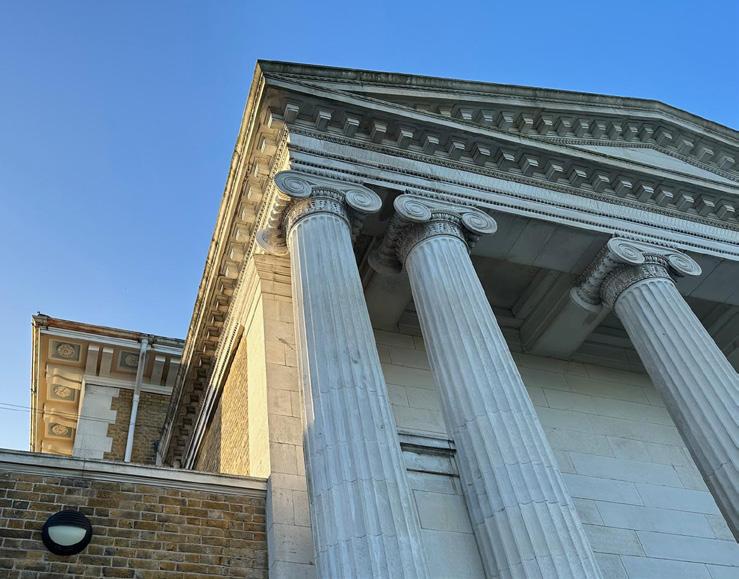 Designed in 1805 by William Wilkins, the Greek Revival south front of what was once the East India College boasts three Ionic porticoes that precisely replicate architectural details from the Acropolis in Athens and achieves architectural drama by its sheer scale, 126 metres across.