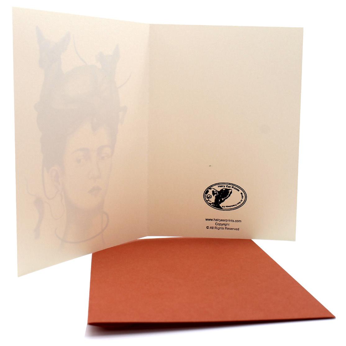 10 x 7 inches (open) 5 x 7 inches (closed) Printed on classic cream, 216 gm. 25% cotton. Small metal charm. Colored envelope/cellophane envelope Suggested retail price: $7.00 Wholesale price: $4.00 Copyright © 2026 Hairy Ear Prints. All rights reserved.