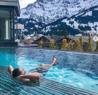 A room with a view from your own private pool in a winter wonderland